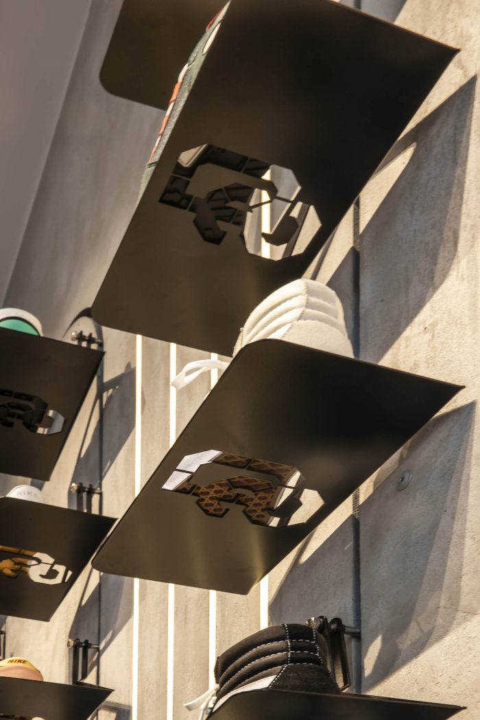 Outside of sneaker inspiration, we accentuated the store’s natural shape with wooden scantlings and Kaufmann Keramik tiles finished with the #sneakerdistrict neon. With only limited apparel, we turned the clothing displays into mini-galleries. Super slim shelving with smoked glass cabinets and mirrored plinths play with your eyes to give you the impression that the clothes are floating.