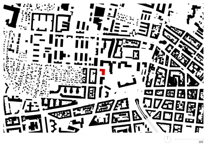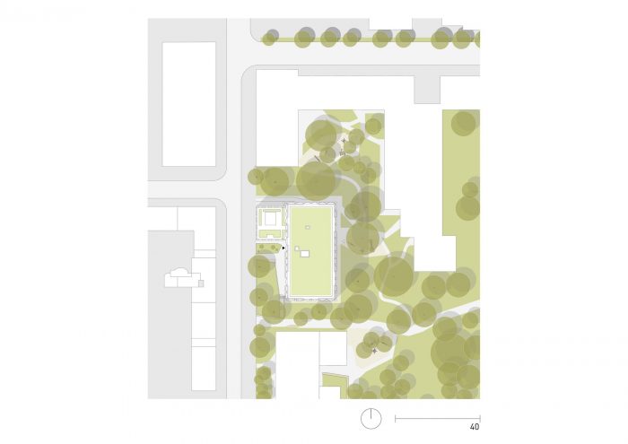 Despite its urban location, the grounds of the former barracks have a spacious green area with a rich stand of trees.