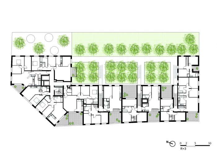 The houses and flats are raised above ground level, since the site is covered by flood prevention regulations. They are reached by means of a pathway that passes through the treetops of a ground-level park, offering residents a gentle transition between private, collective and public spaces along with a view of the entire site.