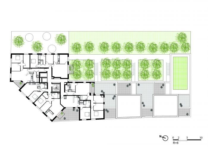 街角的建筑是集体住宅,可以远眺周边的风景,但高度却逐渐向南侧的小广场靠拢,分割开来,形成一个叠加联排别墅的中间环境。这种类型将紧凑的需求与个人住宅或小规模集体住宅的质量结合起来,反映了街区的过去和人们一直在这里生活的方式。