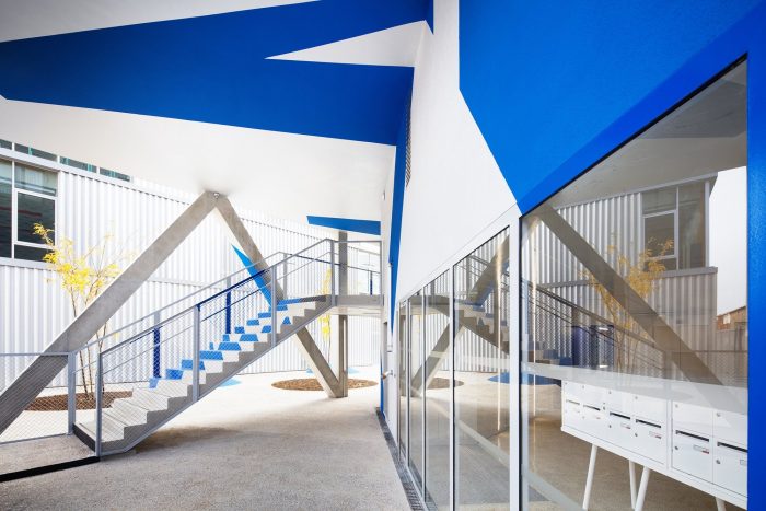 Artistic add-on, Atelier YokYok painted an anamorphosis on the porches, establishing a graphic and playful dialogue with the architecture and the nearby school group.