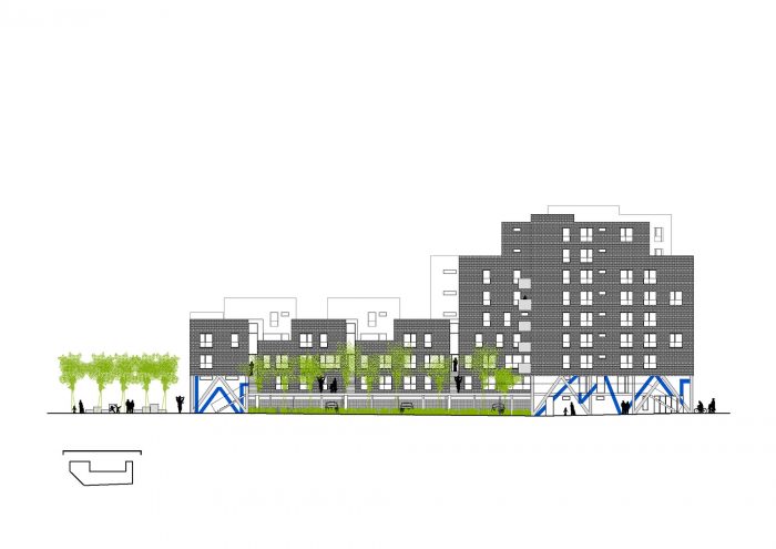 The buildings on the street corner are collective housing and have a far-ranging view out over the neighbourhood, but the height then gradually tails off towards the small square on the south side, splitting up to form an intermediary environment of superimposed townhouses. This typology marries the need for compactness with the quality of individual homes or small-scale collective housing that reflect the neighbourhood’s past and how people have always lived here.