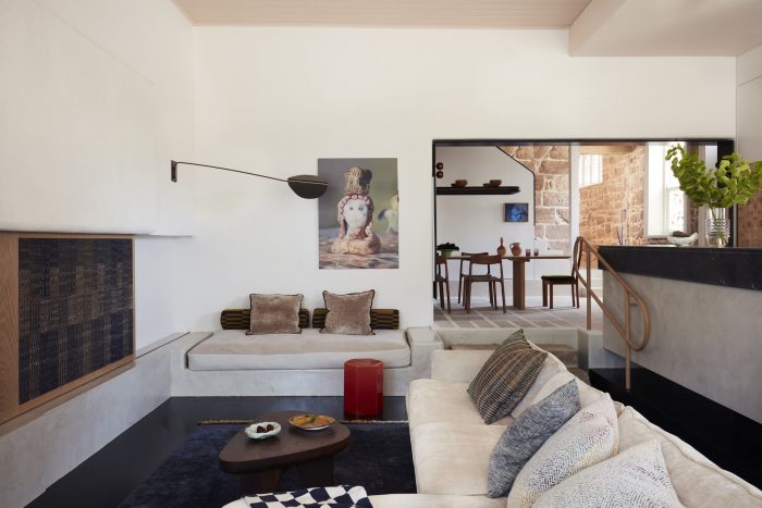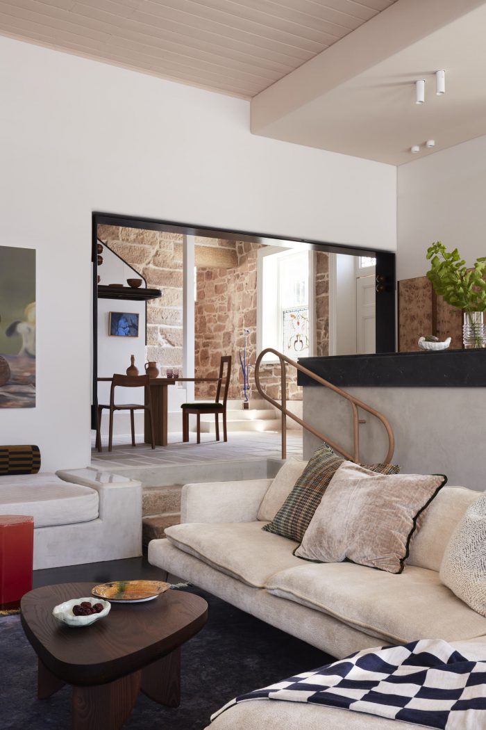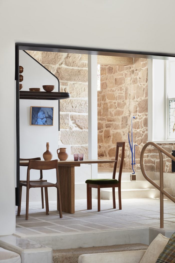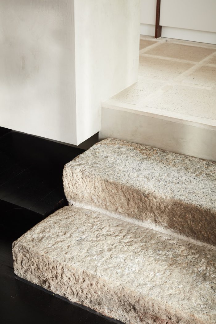 Salvaged granite now articulates the steps leading to the dining area and kitchen (bush hammered to mimic antiquity) and supports the island bench to integrate aged features within;