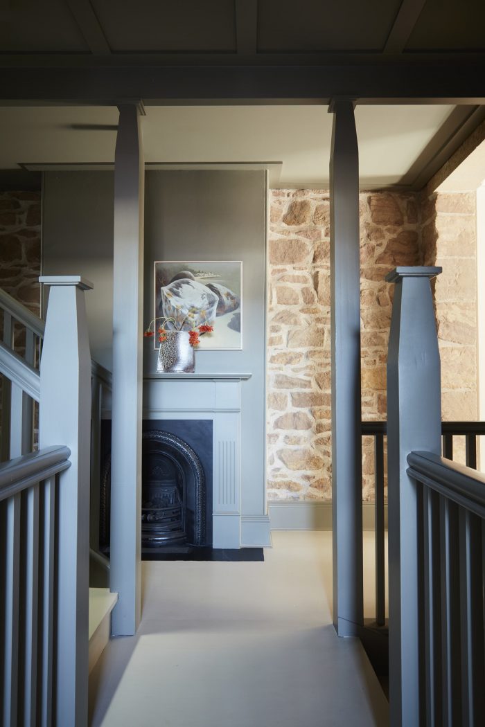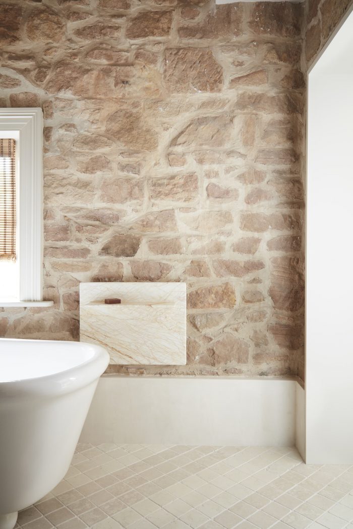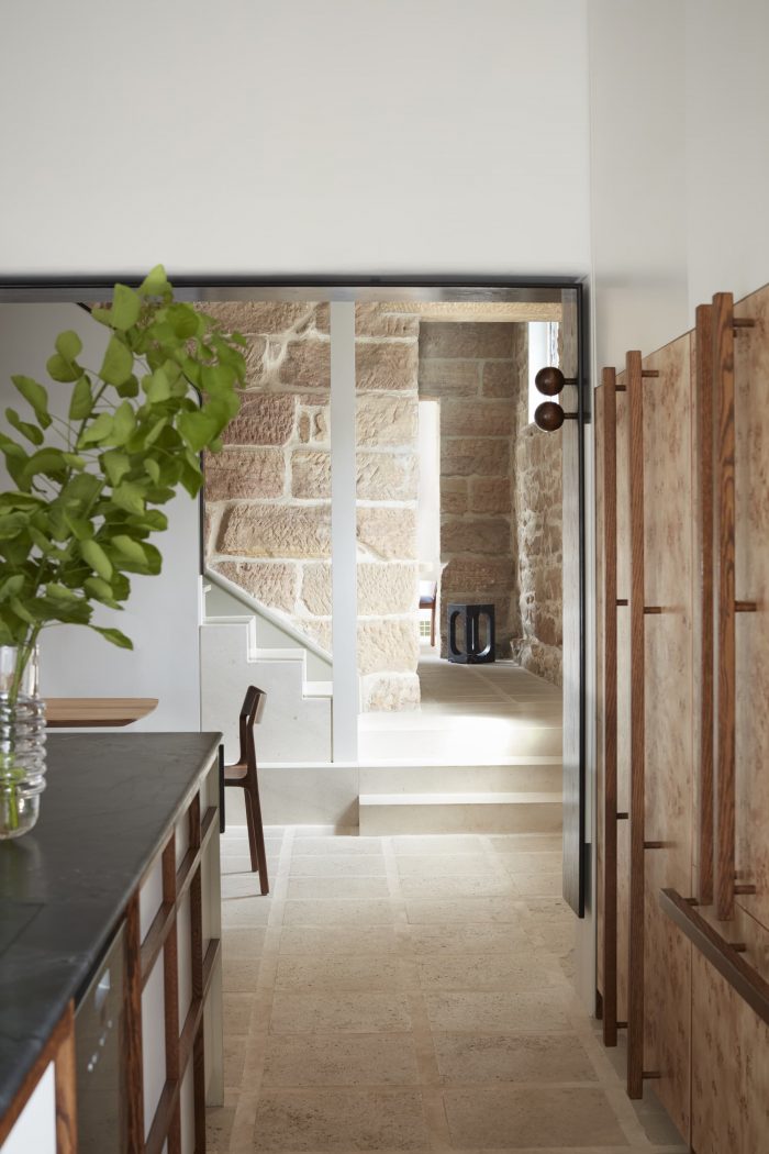 Materiality - Just as all monumental stars need a great support act, tactile finishes and textures play to the splendor of the stone walls. They softly intervene to avoid strong contrasts between old and new, enhancing original features instead. Wooden frames are the reassuring embrace, taking inspiration from shōji. A deep threshold of ebony-stained American Oak highlights the theatre of the dining room like a proscenium arch (subtly acknowledging the outlines of the removed wall). Hovering inches above the floor, it avoids a weighty enclosure. Two gloss-finished solid timber orbs secure the armature on either side, concealing exposed fixings to the surround. This angled arc concept is gently echoed in a bedroom, aesthetically framing walk-in-robe joinery whilst serving as hanging apparatus. Within the master suite, timber frames the wardrobe and bed like tatami matting. Emanating a pearlescent glow granted by textured vintage seagrass wallpaper enhances a mood of luxe seclusion. Similarly, the kitchen’s under-bench joinery hovers within a framing device of latticed timber while the island bench is offset by lithe vertical supports under the heft of leathered quartzite.