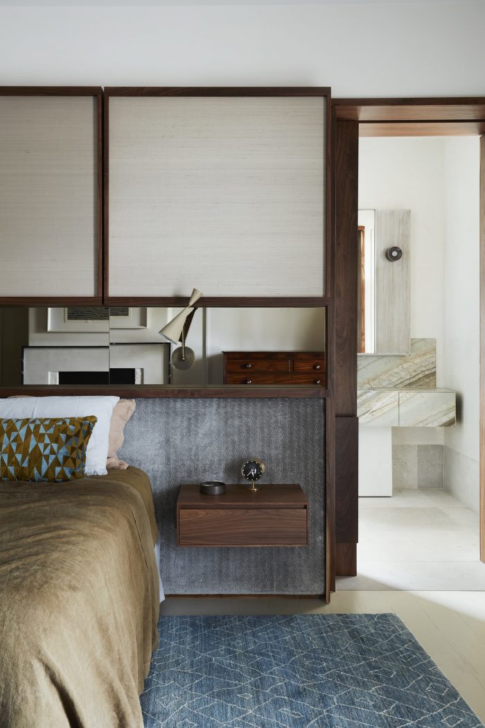 黄水晶和琥珀色在定制的Tappeti地毯的浸染边缘和休息区的长椅上,加上厨房斑驳的白杨树皮门的蜂蜜色泽和主浴室的浮动大理石皂架的铁锈色脉络(从原来的壁炉上拆下来的石头重新使用)。