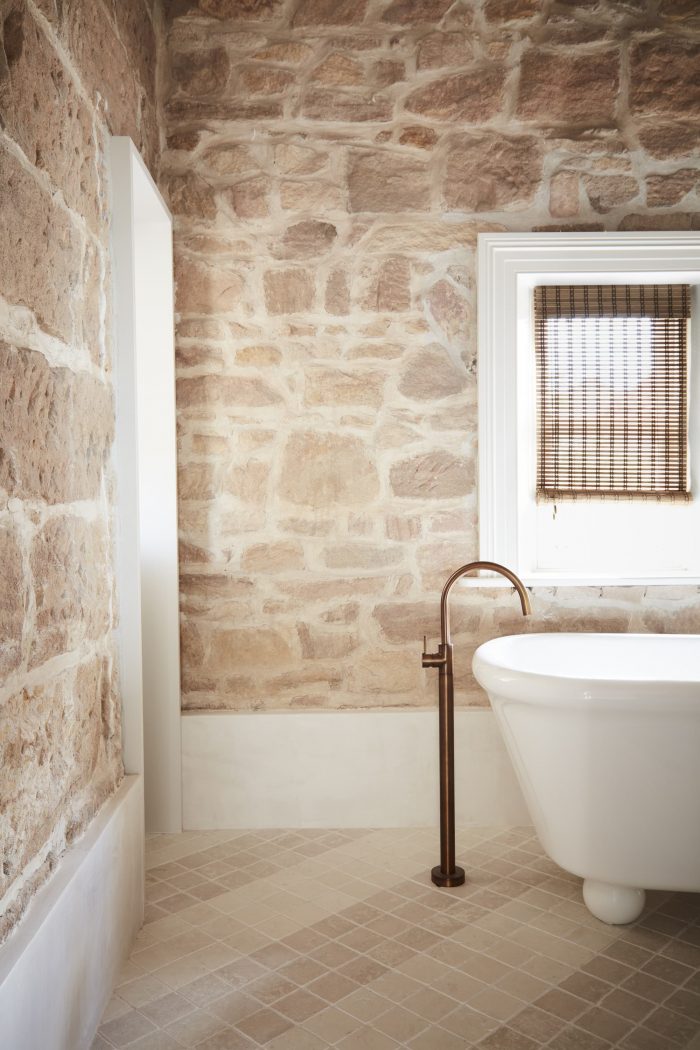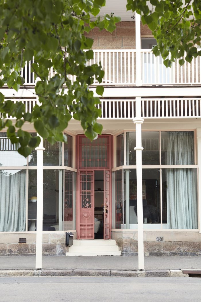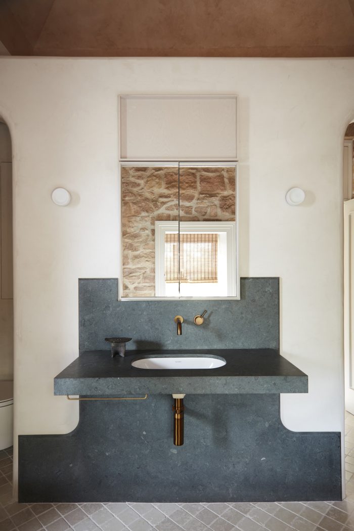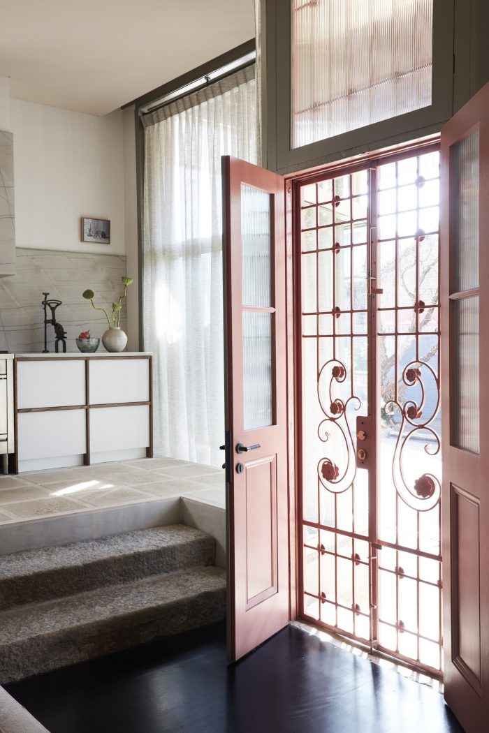 Removing the entry space’s false plaster ceiling revealed original V-groove timber struts painted in a pale peach shade. Complimenting the delicate pink blush that emanates from the stone, they were restored and re-painted in a similar shade, tonally integrating the kitchen’s new bulkhead. Upstairs, the main bathroom’s hero, a vaulted fresco ceiling (revealed after removing plasterboard), pops in the same tone. A darker shade pronounces the restored front door and its steel-framed entry screen with decorative Nouveau floral swirls, ushering unexpected color exploration within.