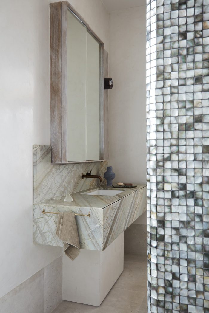 Spaces swell and expand through pattern integration. The square macro outlines of the floor pavers sync in miniature scale with the master en-suite’s mosaic tiles and the salon’s lilac open-weave linen curtains, enhancing flow. Within the main bathroom, the horizontal bands of alternating tones of rose-tinted limestone tiles grant the illusion of sunlight streaming within. Tactical mirror placements visually amplify dimensions and bounce natural light throughout, most notably within the bed frame of the dark master suite. Hard angles are softened via the inclusion of rounded tables, upholstered furnishings, undulating surfaces, and carved nooks including the live edge timber shelving in the lounge and display ledge running the length of the room above the seating perch. The gentle bulge of the hemp-rendered wall supporting the ledge adds cossetting comfort. Upstairs, minimalist adaptations of traditional wainscoting add visual interest to bare walls in the sleeping quarters, with broken linear arrangements upon doors.