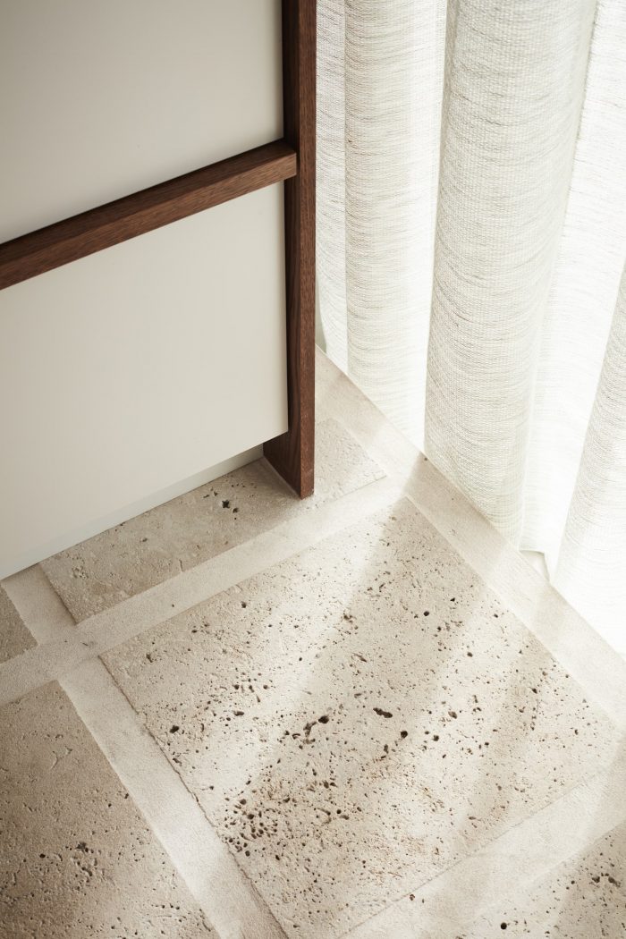 Underfloor heating was installed on the lower level. Newly laid honed travertine pavers (cut to 400mmx400mm squares with 100mm grouting to tonally enhance the sandstone walls) replace existing floorboards in high tread areas. Only the lounge area’s timber was retained and stained ebony;