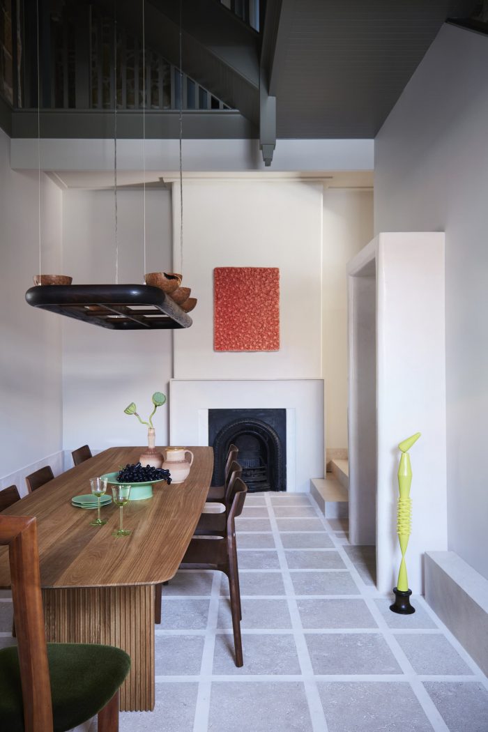 A sandstone wall clad in plasterboard to the rear of the kitchen was removed to create an open dining room (visible from the front entrance) that connected to a new lounge area and kitchen;
