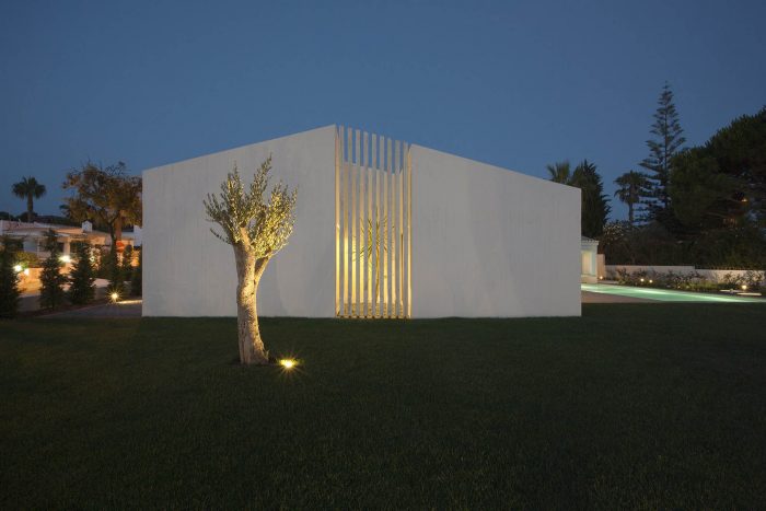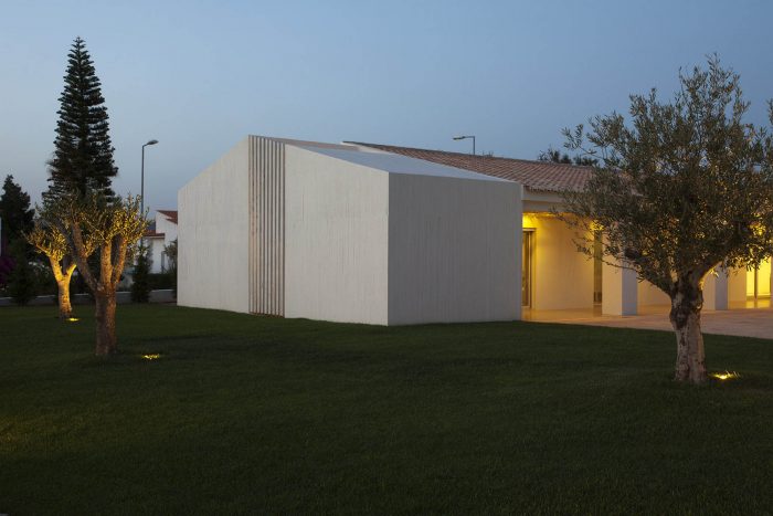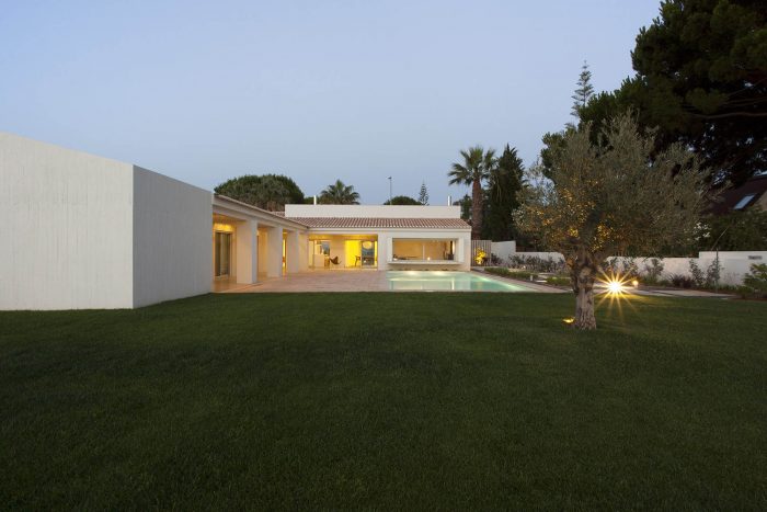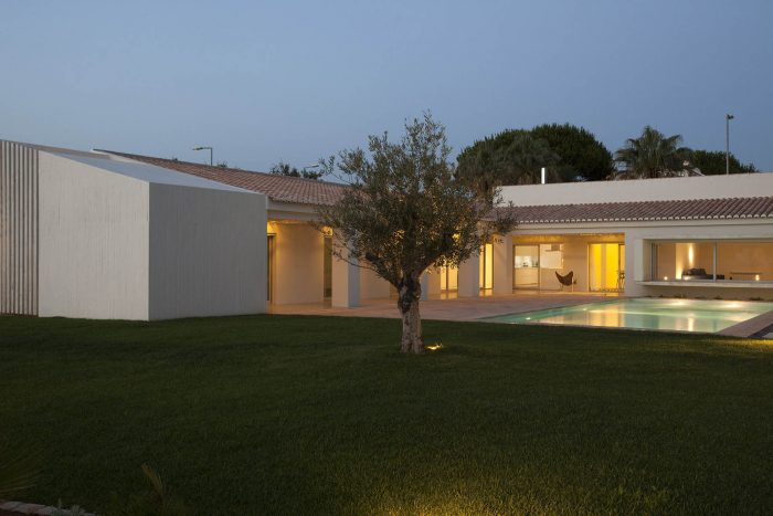 We opted for the use of traditional materials and coatings, as exemplified by the cement materials, plasters, woods, and the pottery of local tradition, combined with the construction of new elements in apparent concrete with wood planks formwork that allowed a certain plasticity to the material, adapting it to the scale of the house program.