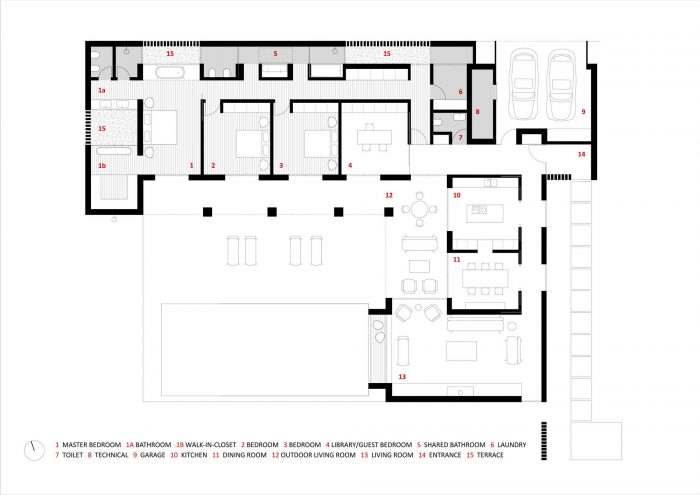 The extension of the pool supports the visual relationship between the living room and the water level while enhancing the connection between the building and the pool around which is located the large outdoor living area.