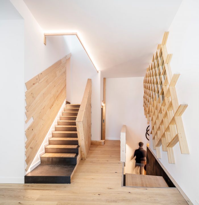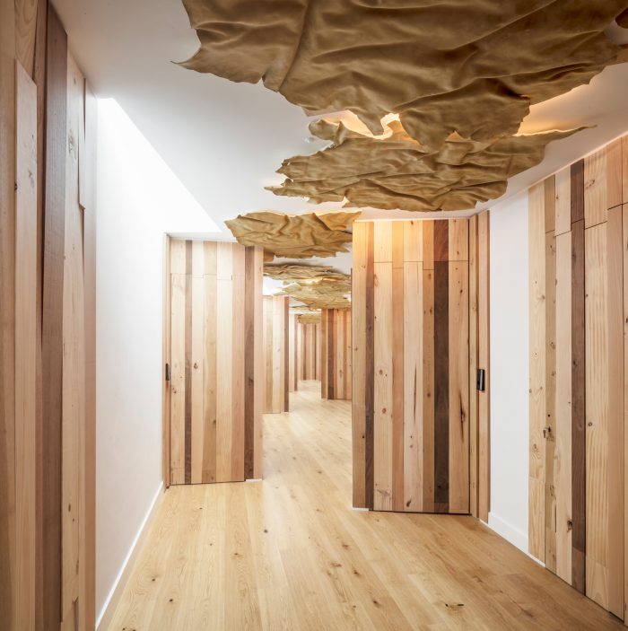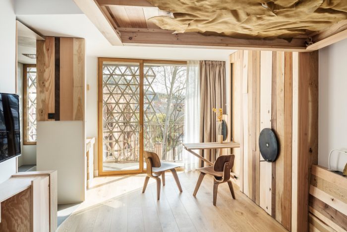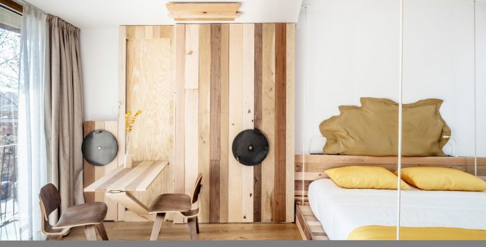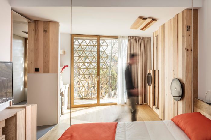 In the interior: leather, wood, and light are the tools used to create comfortable and welcoming spaces that adapt to the needs of guests. The fact that many guests are business travelers means that the rooms are not simply rooms but also meeting and living spaces, made possible by beds that can be tucked away into the ceiling and tables that also disappears, making the space transformable and dynamic.