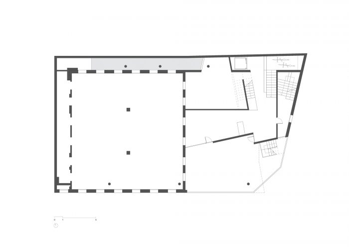 The building is constructed as a light metallic structure that sits atop the old tannery, preserving it in its original state, separated by a line of shadow that shows the contrast of time and also integrates the new with the old, existing framework.