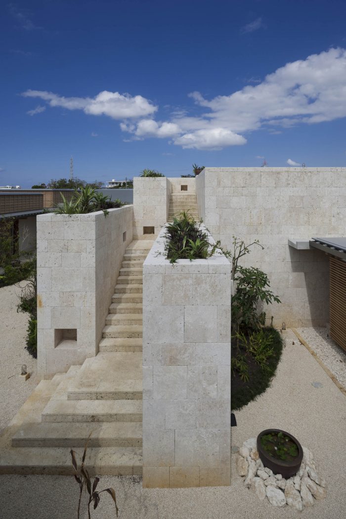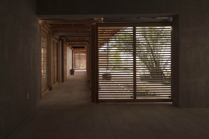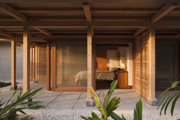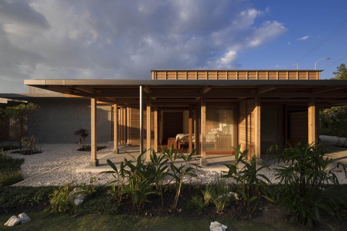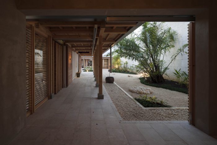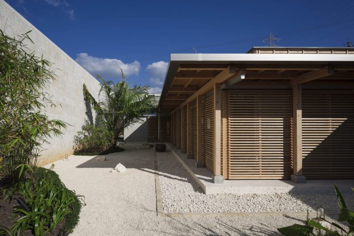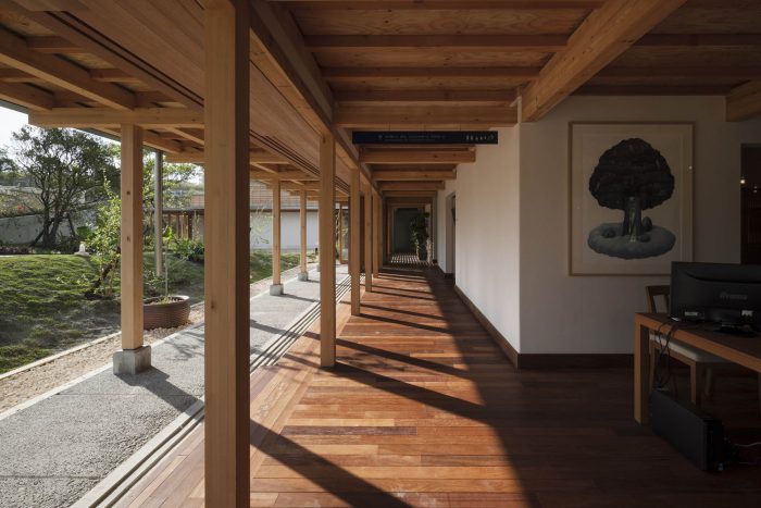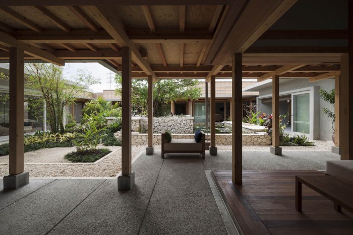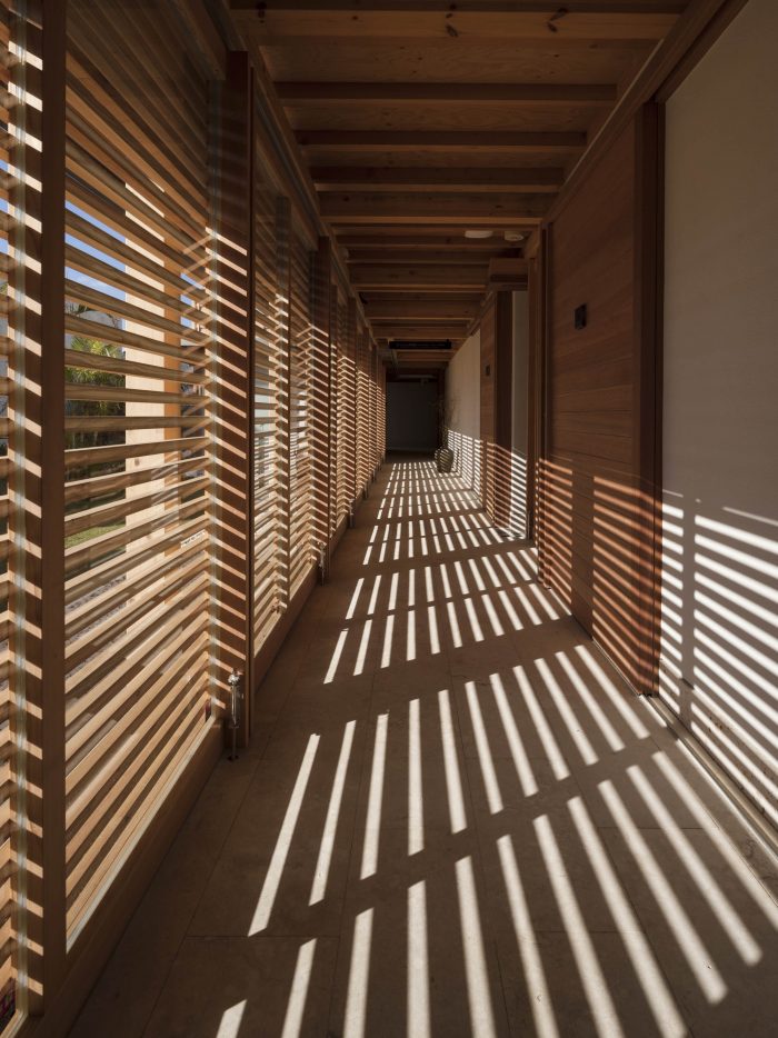 The architecture has deep eaves and wide corridors where nature can be enjoyed from indoors. It is designed such that the rooms could be opened to the outside and to embrace nature from within. Staying cool in under the shade whilst experiencing the Okinawa breeze.