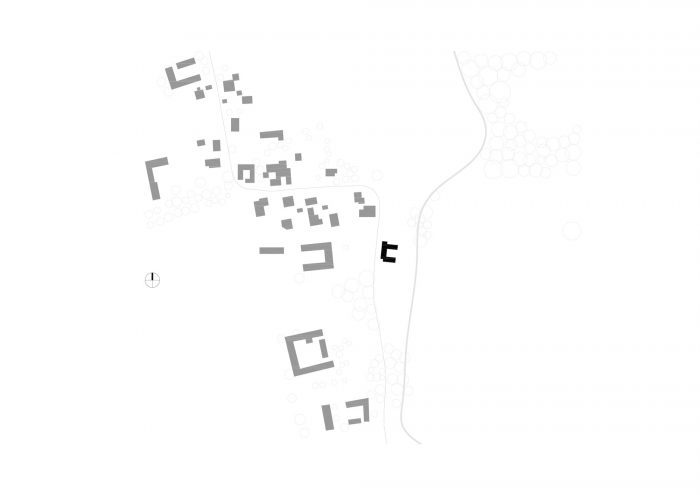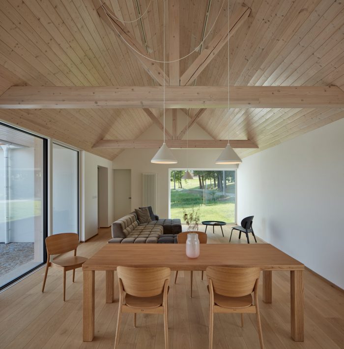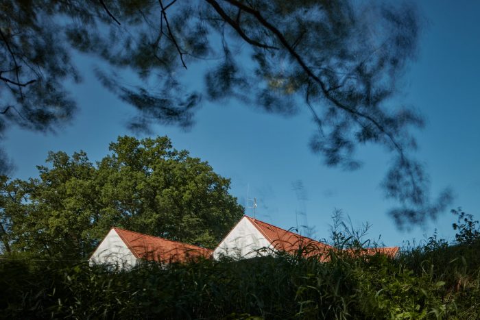 We work with the archetypal shapes of gable roofs and traditional proportions, looking for their spatial variations. There is no need to think too much about the materiality of the house, we follow tradition and experience. White and orange color, plastered walls and beaver tail ceramic tiles appear in the landscape.