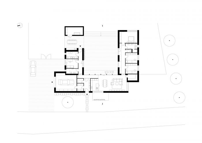 The three-wing building offers technical facilities, a garage, a study room, and an outdoor kitchen with covered seating in one wing. The second wing, parallel to the access road, occupies the entrance and main living space raised to the roof. Glass wall covered with a porch connects it to the yard. The third wing serves as an intimate bedroom area.