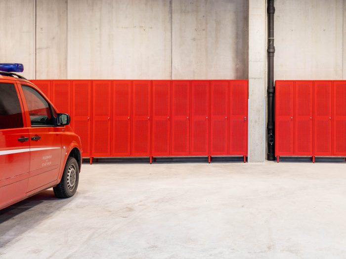 The thermally decoupled design of the vehicle hall is both efficient and sustainable. A high degree of prefabrication was chosen in view of the short construction time, with precast concrete elements and hollow-core slabs spanning the 12-meter-wide hall, where three red fire engines stand ready to turn out at a moment’s notice. Arrayed along the rear wall is a series of red lockers. Elsewhere, the interior of the hall is dominated by fair-faced concrete, a non-flammable material that conveys a sense of safety. To the left of the hall, a high entry gate regulates access to the interior courtyard, which provides space for staff parking and training exercises. To the right, a change in facade height indicates the lower ancillary rooms behind.