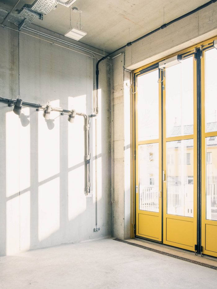 The new build presents a continuous face to Speisinger Straße and gives the forecourt a newfound clarity. While the outsized vehicle hall, rising to a height of six meters, blends into the larger urban context, the functional building envelope with its characteristically high folding garage doors provides a very individual stamp. The column-and-architrave style facade creates an unexpectedly tectonic effect and the functional drop-in facade height creates a welcome gap at the junction with the adjoining firewall on the right.