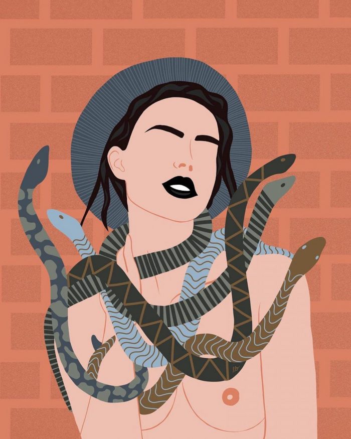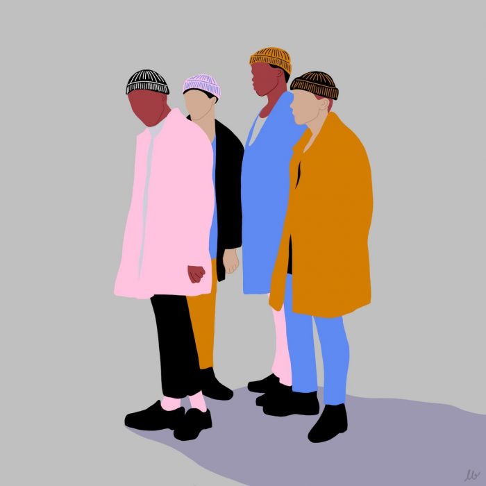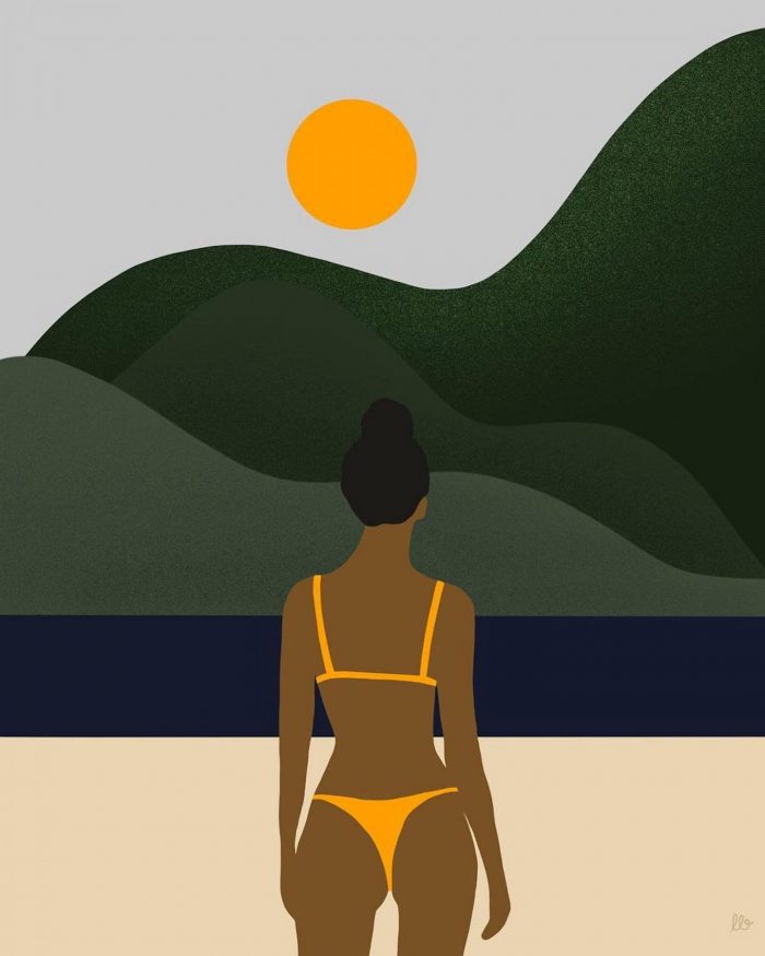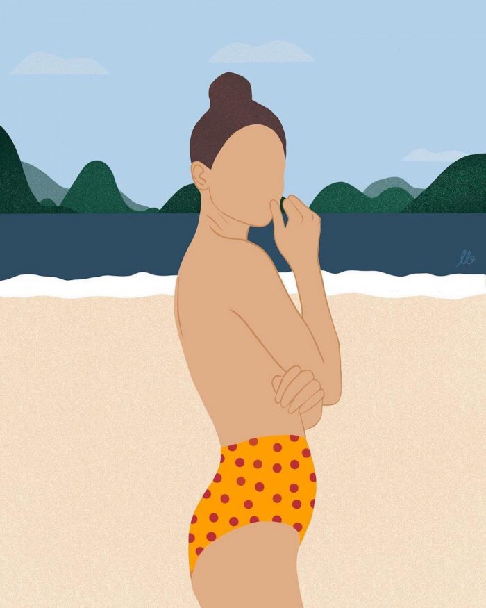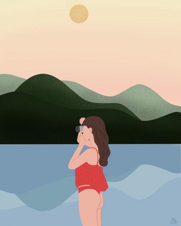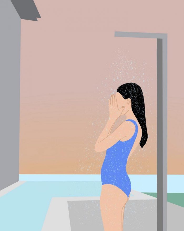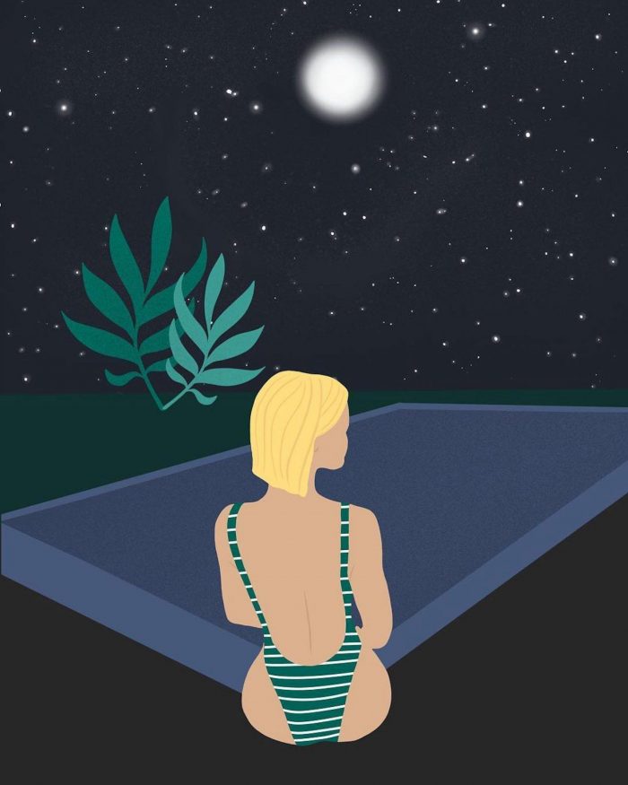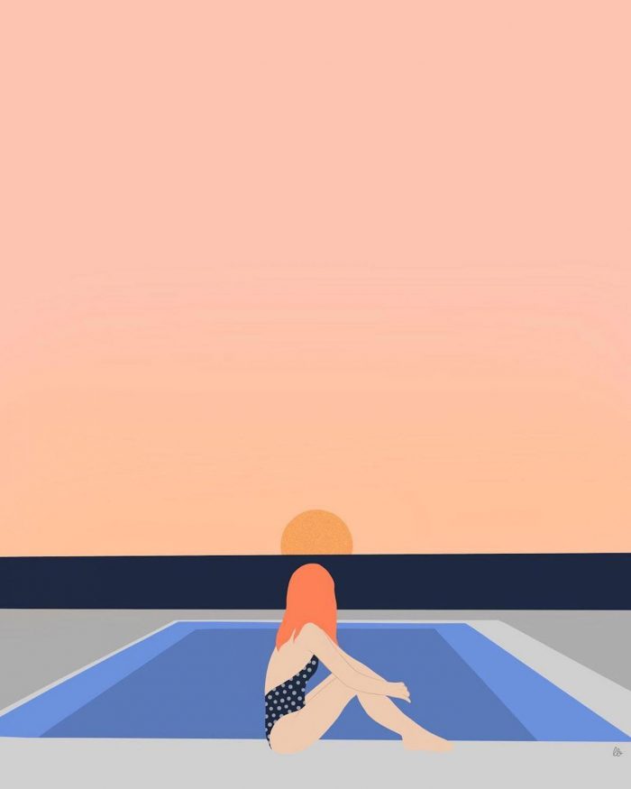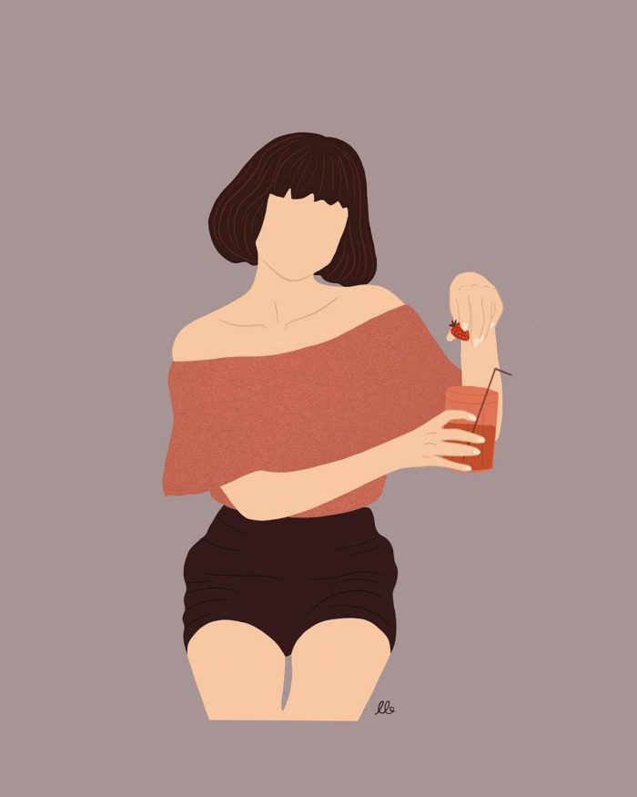We are chatting outside in direct sunshine; it’s afternoon in early spring and the summer atmosphere is finally approaching. “When the weather is warm enough I like to sit in parks and work. The color combinations of people in nature shape up to be nice first compositions, and I think, ‘Oh, I have to sketch that!’”, she explains. Bohr’s multicolored images of urban culture, fashion, and relationships, originate from observing friends and strangers going about their daily, modern lives. “I start with people watching, usually from a cafe”, she says. “I’m interested in how urban surroundings shape people’s experiences—the little things we do each day”. This includes situations like drinking coffee, relaxing with friends, embracing a lover, or smoking cigarettes. “The relatable things”, she laughs