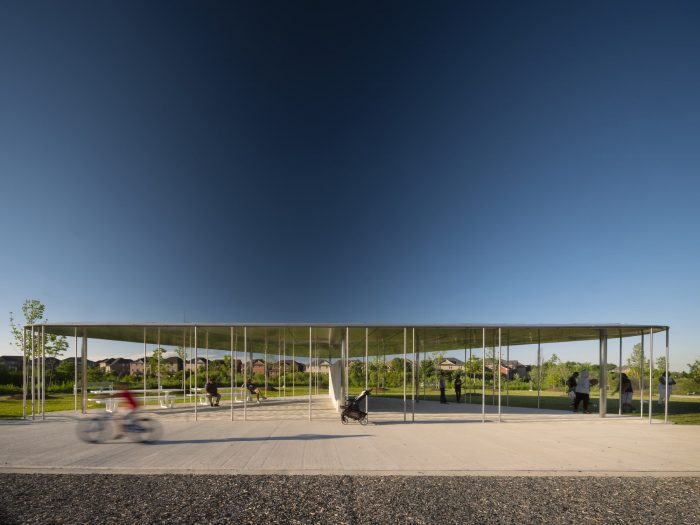 In the City of Brampton, about 45 minutes west of Toronto, the Springdale Library and Komagata Maru Park provide the suburban community with a new public library and community park. RDHA’s goal was to create an inclusive gathering place, a counterpoint to the otherwise at a suburban area, and a point of pride for the city. The project site was physically constrained, framed by a commercial plaza to the east, a main road to the south, and a natural ravine to the north and west. The architects positioned the library as close to the street as possible, in order to solidify the building’s presence in the street, preserve the site’s natural topography and irrigation patterns, and channel interior views towards the ravine. This siting also maximized room in the rear for a neighborhood park and a parking and drop-off sequence with a canopied entry forecourt.