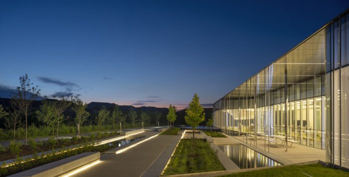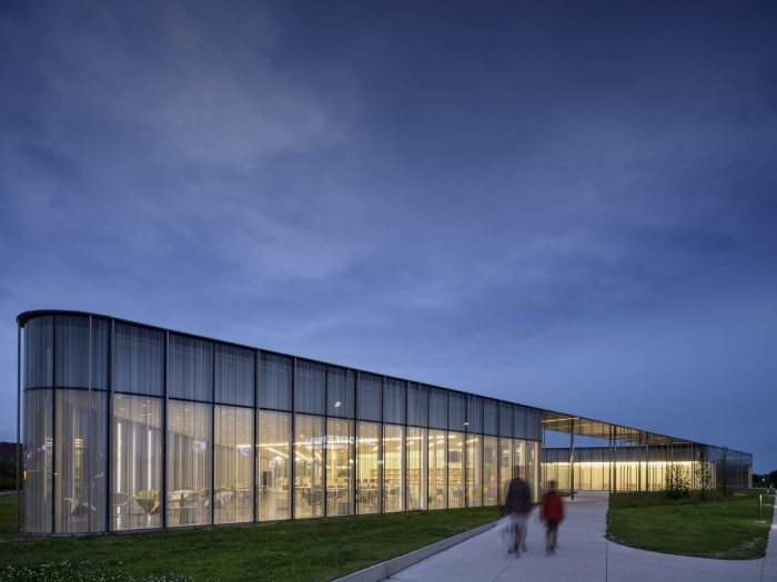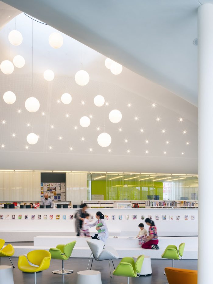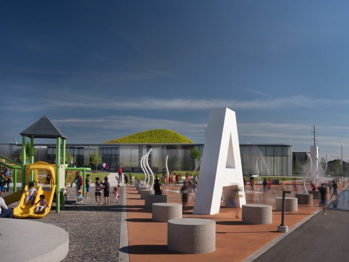 RDHA designed a project that would be as much about a building as it is about establishing a landscape: from the organically shaped perimeter that joins building and courtyards; and the creation of an undulating topography between the fluidly shaped ceiling and mountainous green roof; and the sloping floor slab of the interior and the at landscape of the park. The park is comprised of a series of terraced contemplative gardens for older users as well as a splash pad and children’s play area organized around the word “Imagine.” The five-meter-high letters are oriented in both horizontal and vertical planes and become an interactive feature for the children to discover.