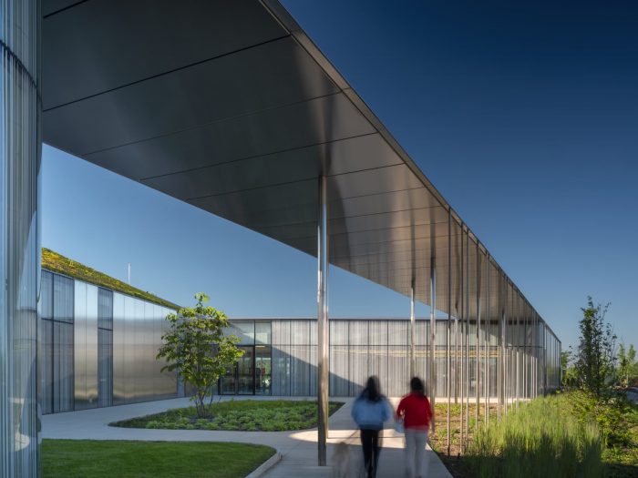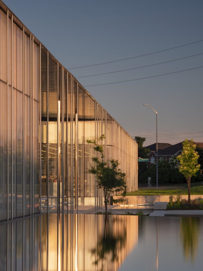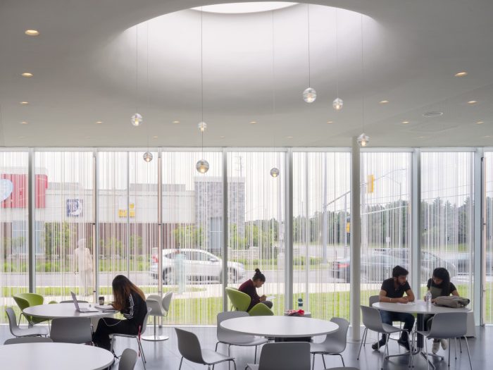 RDHA Design Principal Tyler Sharp collaborated with Brady Peters, a generative design specialist at the University of Toronto, to create a solar-responsive ceramic frit pattern on the building’s windows. Its striated patterns range from white to dark gray expanding and contracting based on solar orientations, while also visually merging with a series of stainless steel rods that add an additional layer of solar resistance while supporting the glazed units and forming the courtyard enclosures. These elements are conceived as a functional abstraction of two combined metaphors: the turning pages of a library book and the trunks of trees in a forest.