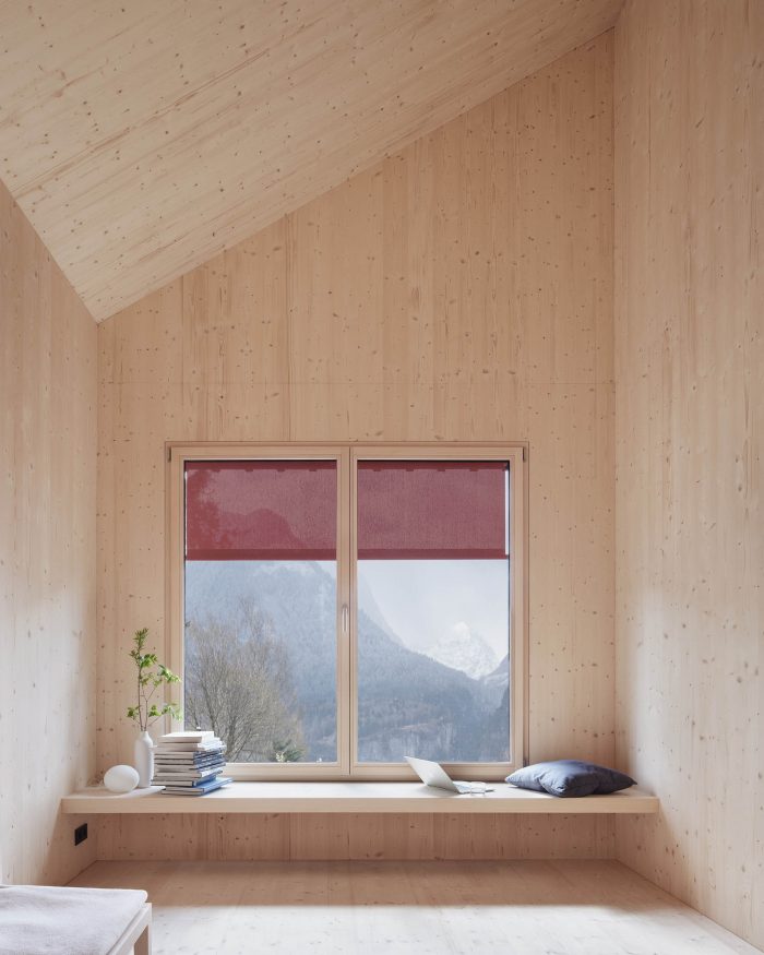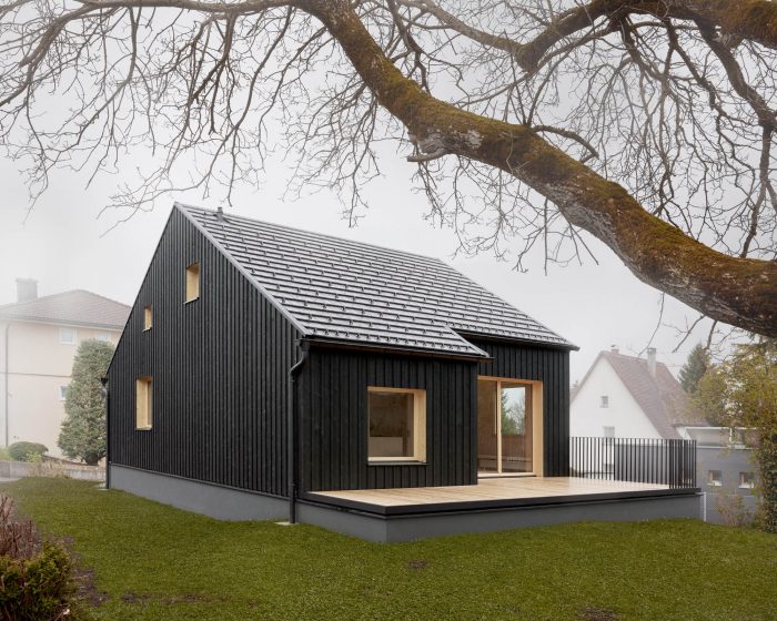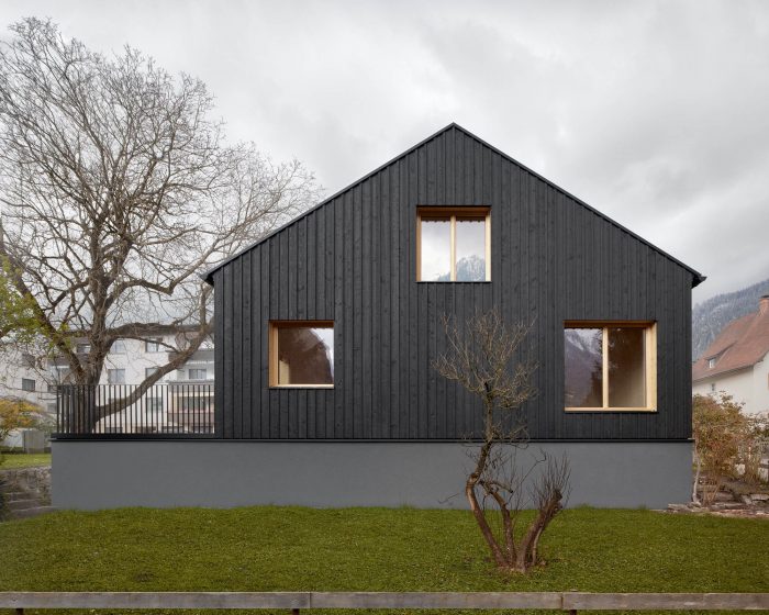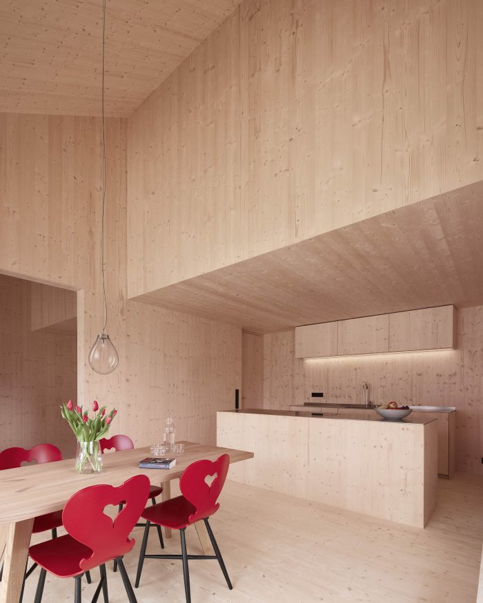 Formally, the building is based on the qualities of the existing building. The dark façade, the light window frames, and the red shutters are reinterpreted. The interior, which was clad with a lot of wood in the existing building and was more reminiscent of an alpine hut than a residential house, is translated accordingly.