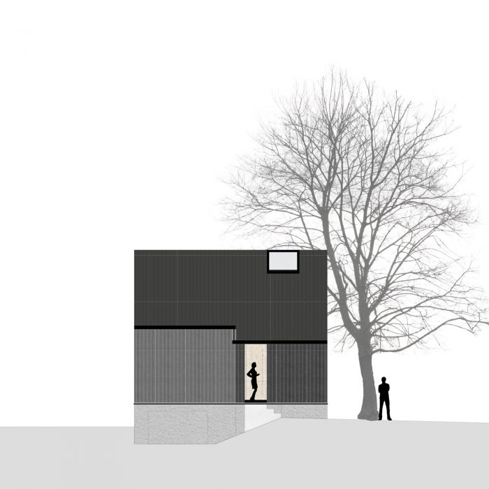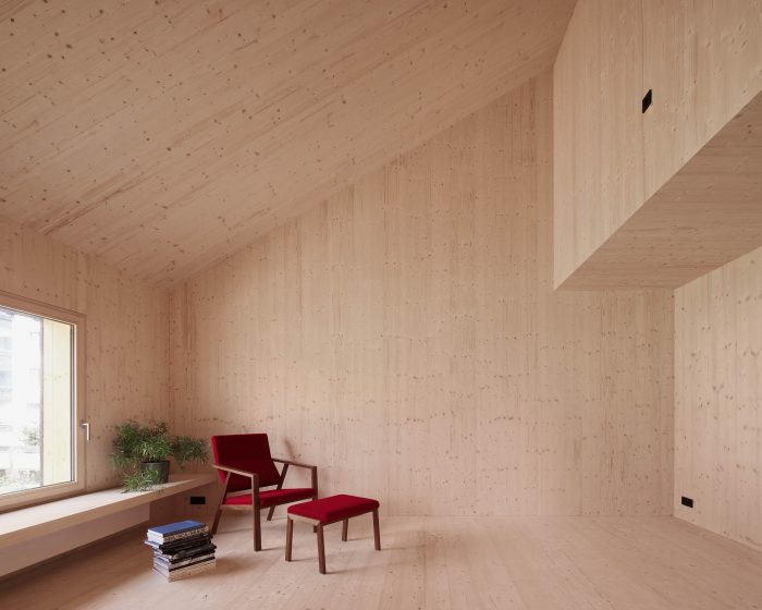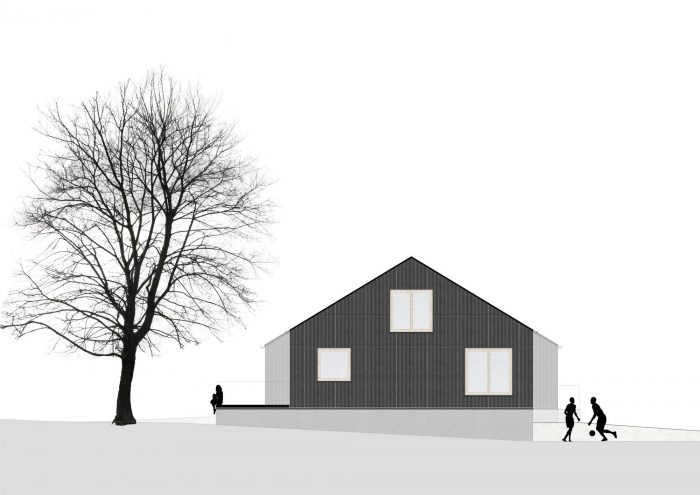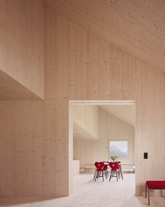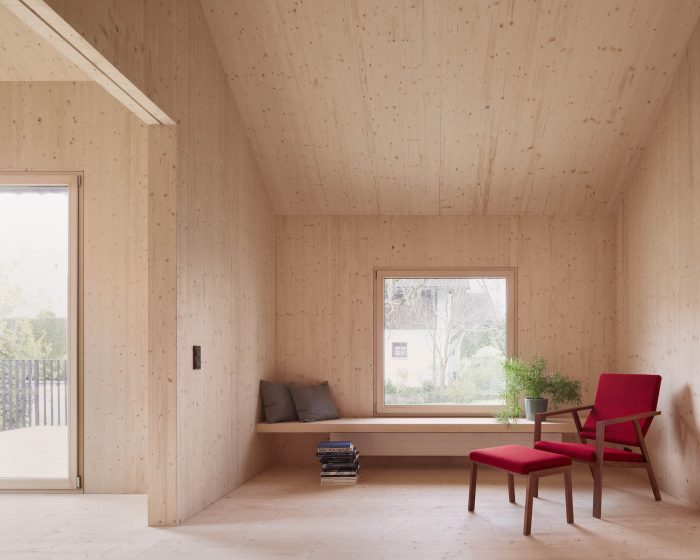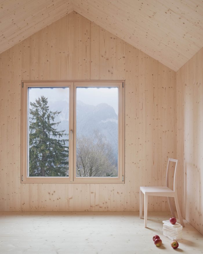 The simple construction of the existing building gave the basic idea for simple, economical, and economic construction. The wall construction consists of a back-ventilated cover strip facade made of spruce followed by a wood frame construction filled with cellulose. This is already followed by the inner, structural as well as architectural, skin consisting of spruce panels. The floor structure is a beam layer with insulating fill, also planked with spruce boards. The wood materials, including the windows, are all spruce and untreated.