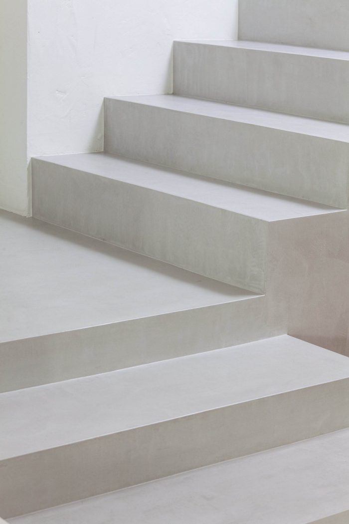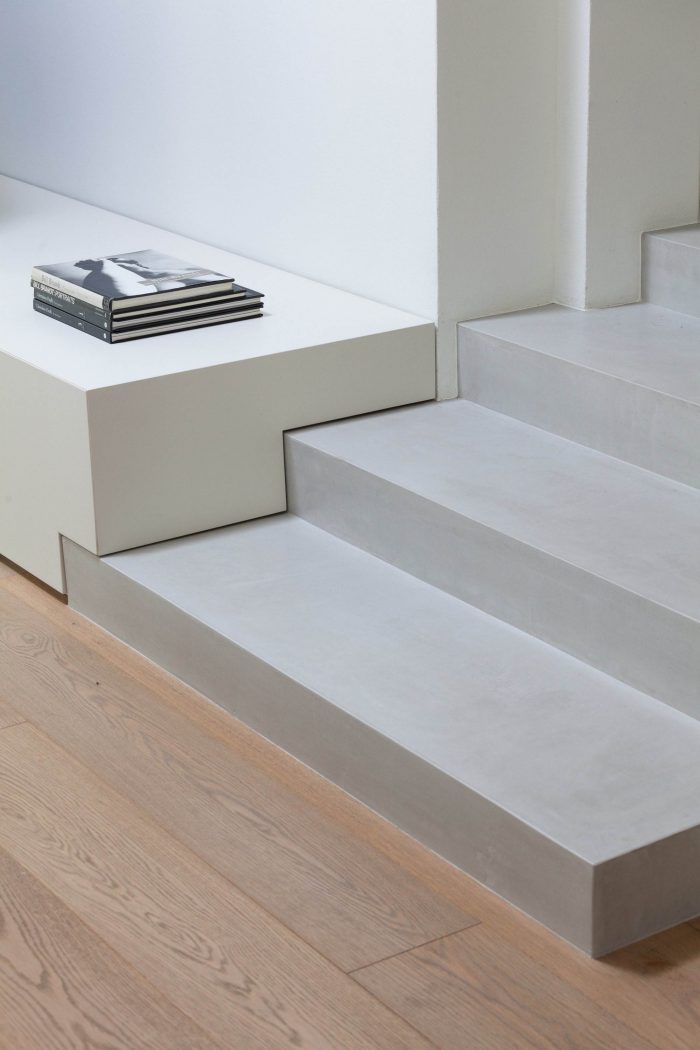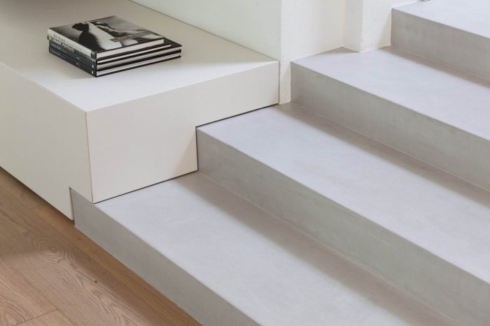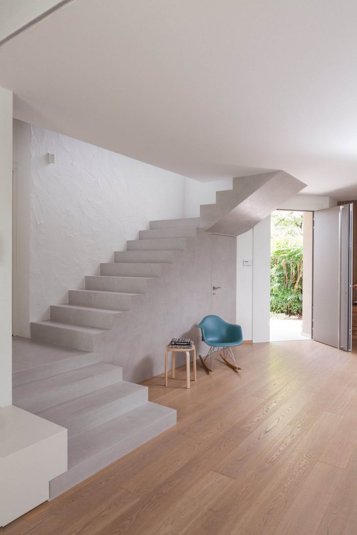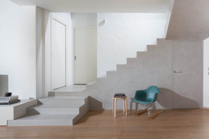 The strong presence, combined with its particular spatial articulation and cherry wood cladding, of the existing staircase makes it the main object visible from any point of the living room. The staircase is simplified to its basic shape by eliminating all decorations and the use of a neutral color tone blending into the environment new identity.