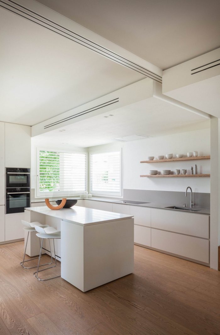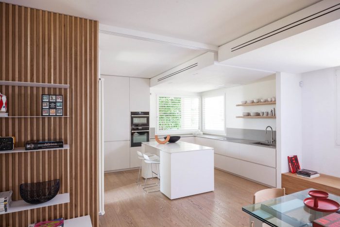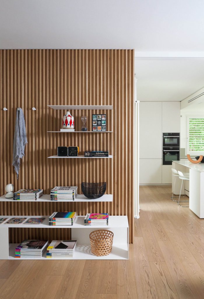 The reorganization of the internal space includes the demolition of the partition wall dividing the kitchen area from the rest of the living hall and the much needed increase of the kitchen top surface with a central island functioning both as a working and snack area. Glass operable walls separates, when needed, the cooking zone from the rest of the house keeping a visual connection between users of the different areas. When in rest position the operable partitions are hidden by a timber slat wall fitted with metal shelves in white painted finish.