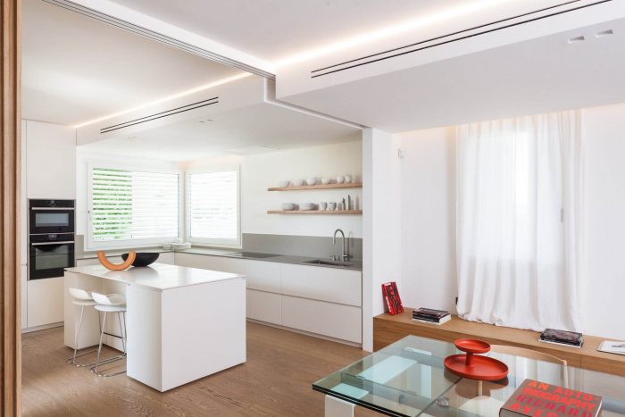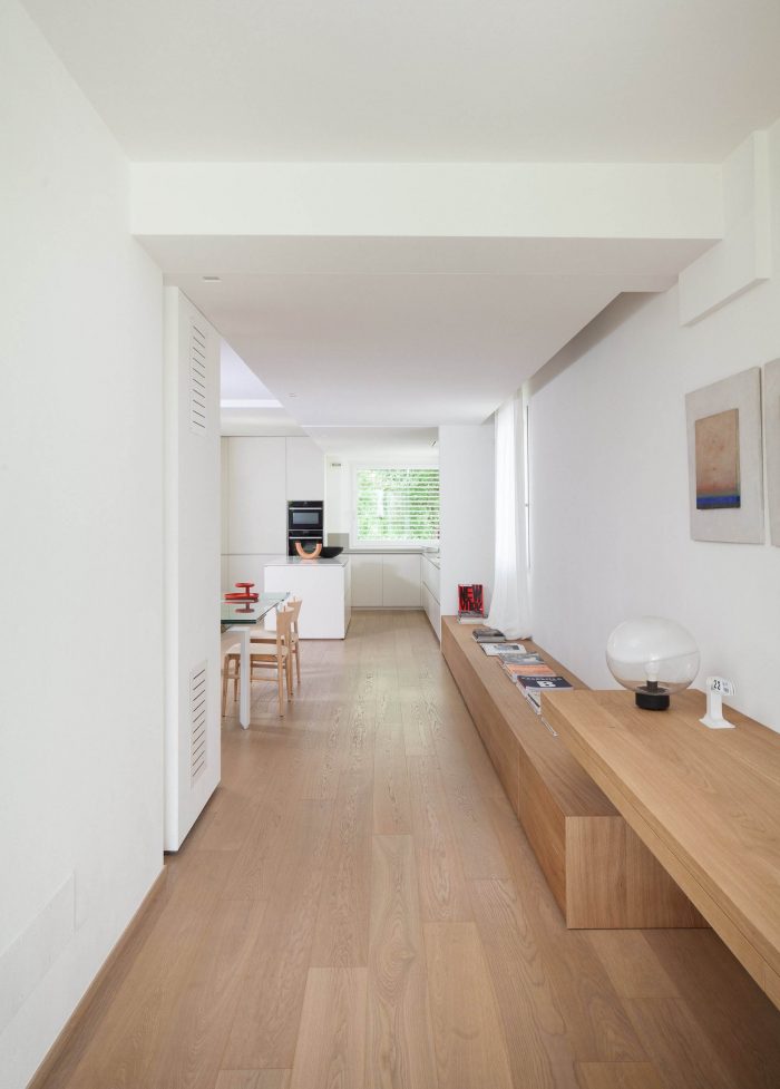 The need to simplify the existing different finishes lead to a basic material and color palette alternating oak wood to white elements inspired by existing timber floor. The air conditioning and the additional heating system are hidden in the false ceiling that creates a functional hierarchy by clearly identifying the service space from the living area. The light design is based on cove lighting supported by a new false ceiling which crosses the entire length of the connecting visually the “service area” of the ground floor. Direct spot light is used when needed in particular areas such as the kitchen working area.