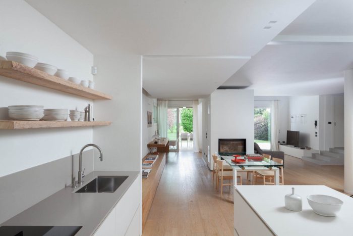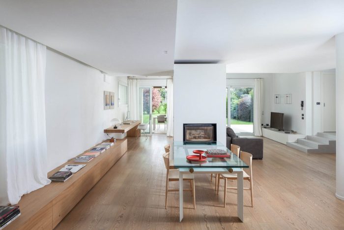 The existing house is located in a residential district in a small town near Bassano del Grappa at the foot of the Pre – Alpi Venete by the shore of the Brenta river. The project wants to create a new and own identity providing a free, fluid and luminous space on the ground floor in which the architectural elements, added and eliminated, adapt to the new open space. Visual connections between interior and exterior are maximized by creating low and parietal pieces of furniture ensuring a free and wide space, eliminating internal full partitions by using glass surfaces. This permits the entry to a controlled natural lighting thanks to the external porch and to maintain views towards the garden.