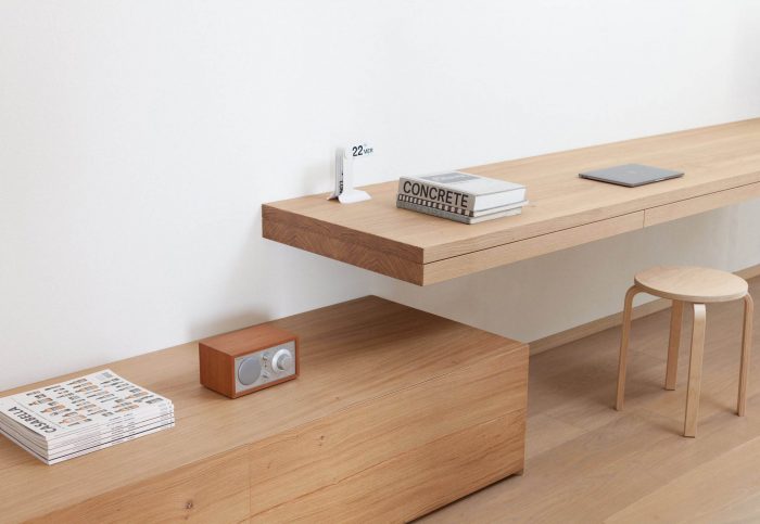 简化现有的不同装饰的需要导致了一个基本的材料和调色板,即从现有的木地板中获得灵感的橡木和白色元素的交替。空调和额外的供暖系统隐藏在假天花板中,通过明确区分服务空间和生活区,创造了一个功能层次。 灯光设计是基于由一个新的假天花板支持的凹槽照明,它跨越了整个长度,在视觉上连接了底层的 "服务区"。在特定的区域,如厨房工作区,需要时使用直接射灯。
