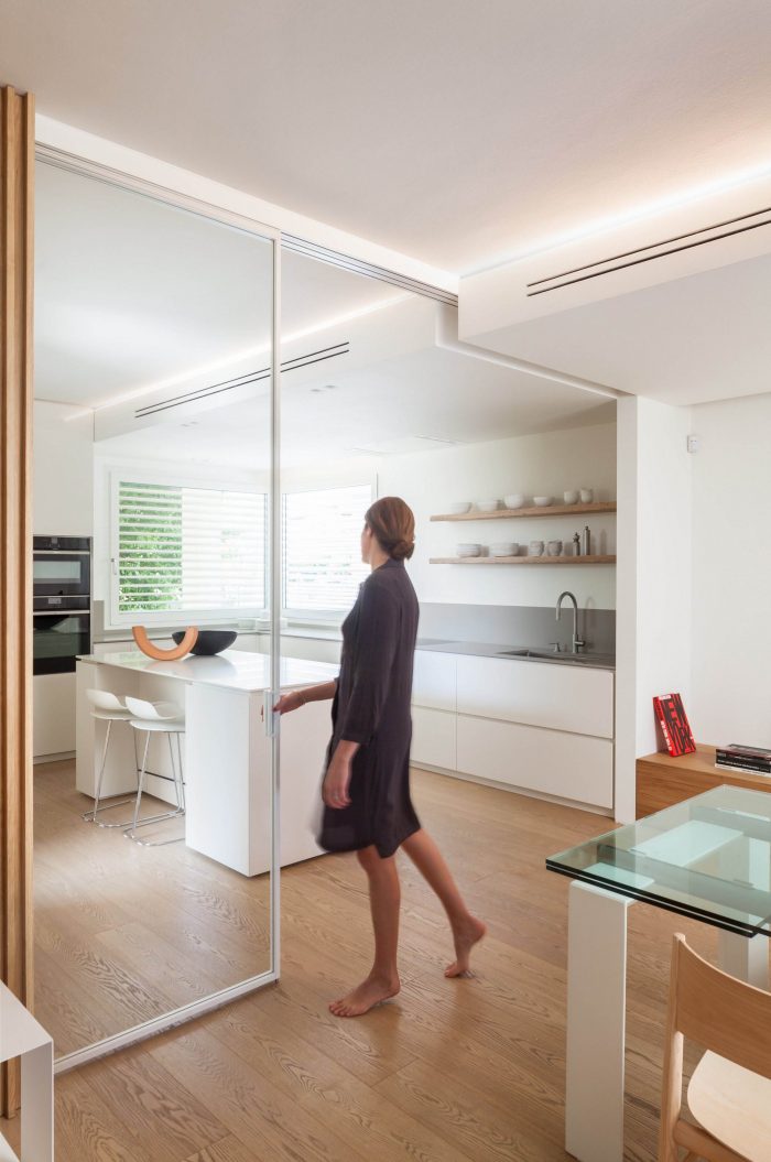 内部空间的重组包括拆除将厨房区域与起居室其他区域隔开的隔断墙,并根据需要增加了厨房顶部的面积,中央岛既是工作区又是小吃区。在需要的时候,玻璃可操作墙将烹饪区与房子的其他部分分开,使不同区域的用户之间保持视觉上的联系。在休息状态下,可操作的隔断被安装有白色漆面金属架的木质板条墙所隐藏。