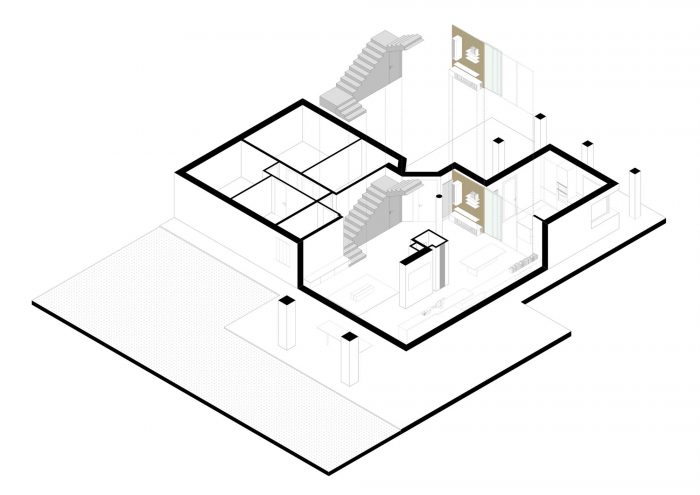 Interior SS is a restyling aimed at simplifying, uniformizing and visualizing the ground floor of an existing house, last restored in the late 1990s, which had layers of very diverse overlapping additions. The presence and the particular location of strong structural elements - such as the staircase, the central column - and visible parts from previous renovation projects characterize the space.