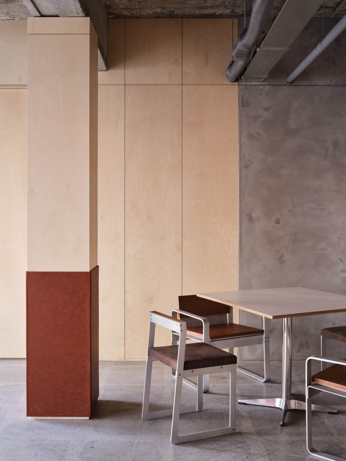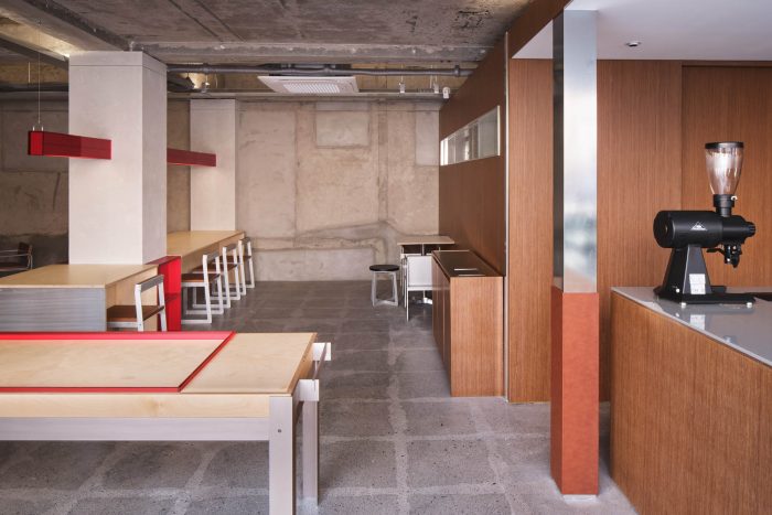 The main door where customers come in and the heavy doors installed for ventilation are made of zinc steel sheets. In addition, the windows with visible inside are closed with regular intervals of birch plywood, so that the inside atmosphere is naturally harmonized. We designed this place to have a vibe unique to SSAP by unifying the relationship between the interior and the exterior space (form/texture/color/ atmosphere).