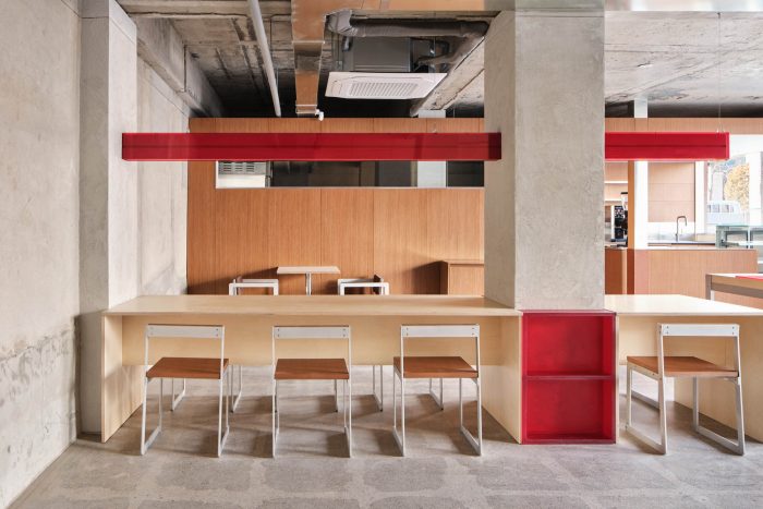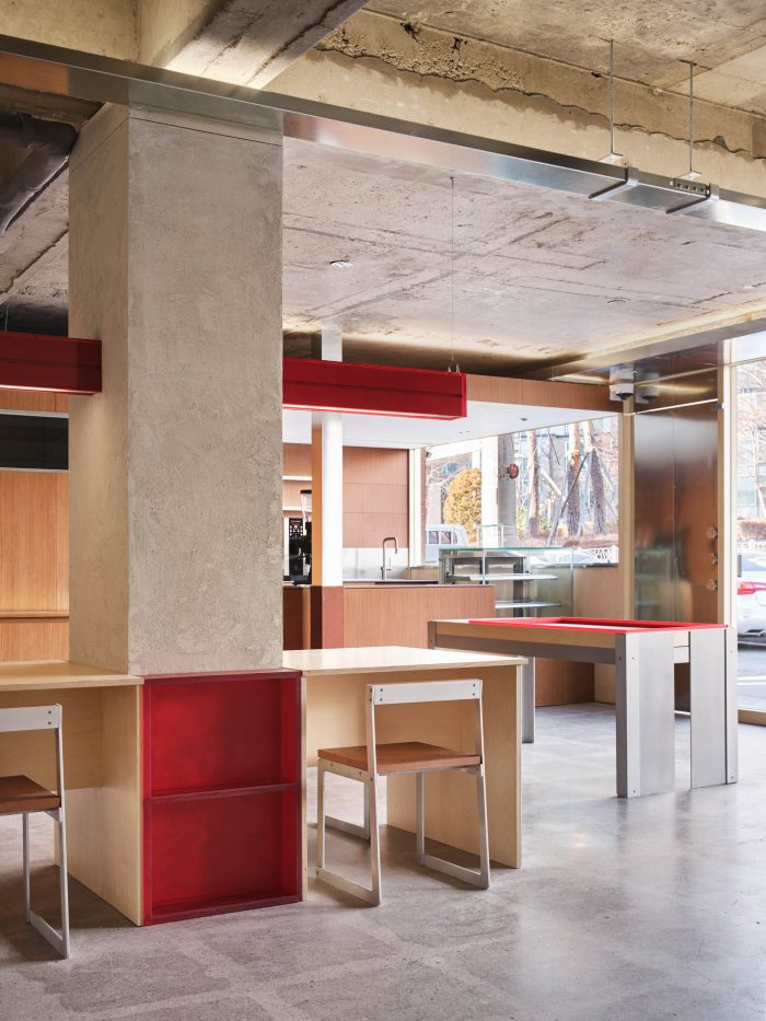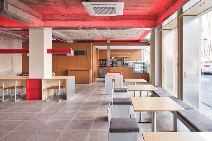 It is also designed to form an organic relationship with this space form acrylic lighting. The cafe uses a focal color of red for cabinets, chairs, bakery showcases, and raceways, where minor electric circuits pass.