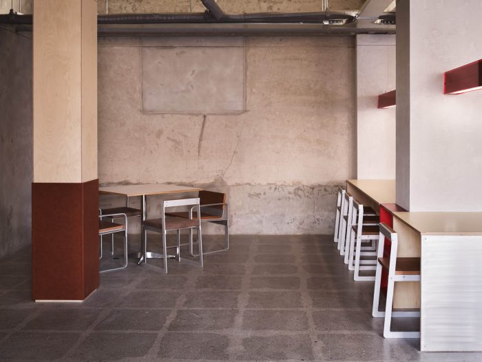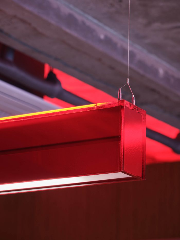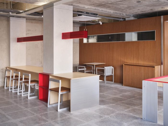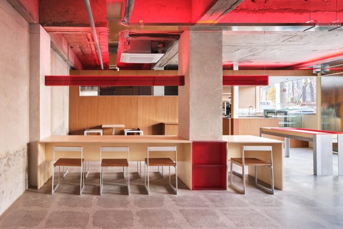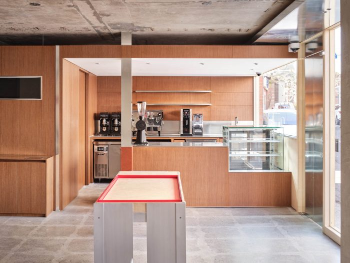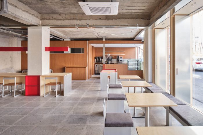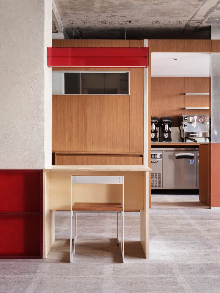 它还被设计成与这个空间形式的亚克力照明形成有机关系。咖啡馆的柜子、椅子、面包店的陈列柜和小电路通过的滚道使用了红色的焦点颜色。