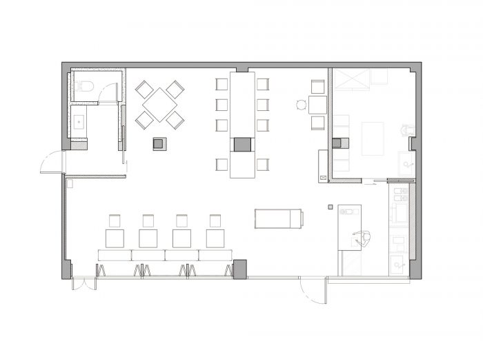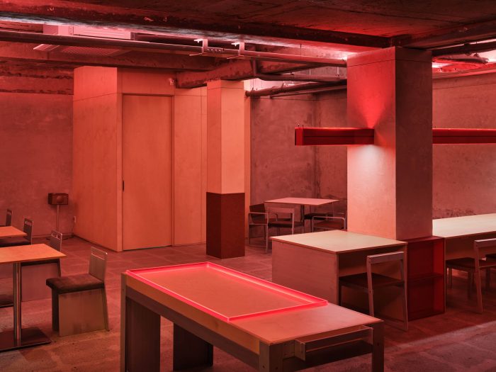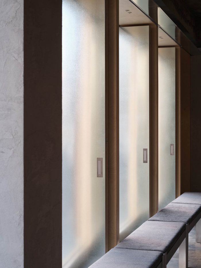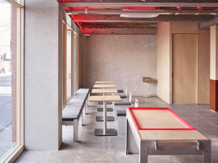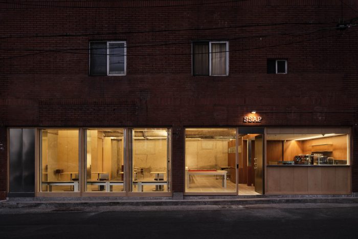 顾客进来的大门和为通风而安装的重门是由锌钢板制成的。此外,可以看到里面的窗户都是用桦木胶合板定期封闭的,这样里面的气氛就自然和谐了。我们通过统一内部和外部空间的关系(形式/纹理/颜色/气氛),将这个地方设计成SSAP特有的氛围。
