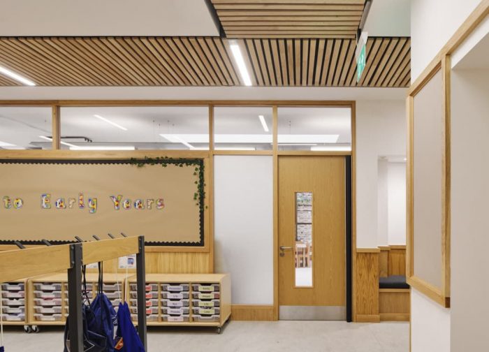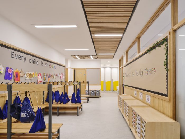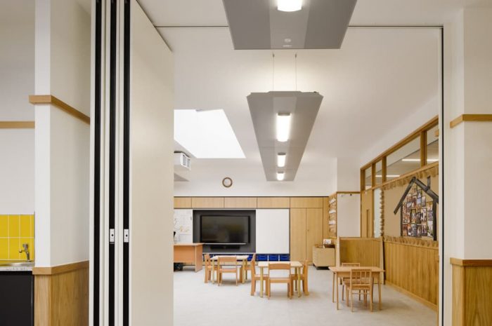 The existing change in levels across the ground floor permitted generous ceiling heights in the early year wing, which are punctuated by large roof lights in the reception classrooms contributing to a spacious, light, and airy learning environment. The two reception classes are linked by a full-height sliding folding door allowing flexibility of use.