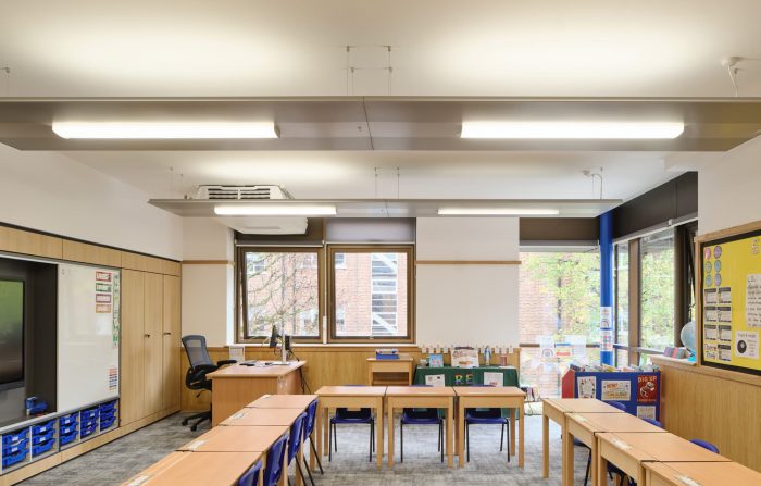 Classrooms are all ventilated through a mixed mode system combining ceiling-mounted natural ventilation heat recovery units connected to external louvers incorporated within the window system, working in conjunction with opening windows. Floating ceiling rafts provide lighting and acoustic control.