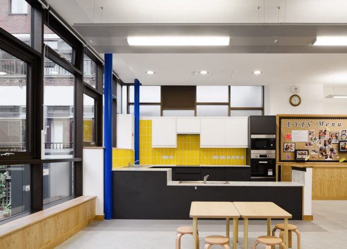 The Early Years Wing is slightly separated from the main school and is arranged around a generous internal space with benches, coat hooks, and open access toilets, with clerestory glazing and glazed side panels drawing natural light into the space. Bright yellow tiles and toilet doors add a pop of color to the spaces, with circular steel columns picked out in St Christina’s blue. A new group room supports one-to-one learning and a “calm space” for children and a small niche in the corridor provides the opportunity for informal reading. Glazed on three sides, the nursery was repositioned and extended and incorporates a colorful, fully working kitchen that allows supervised baking and food preparation.