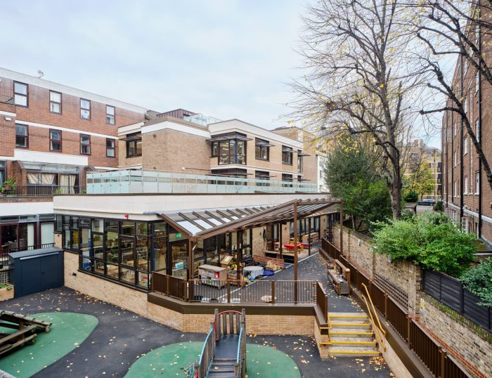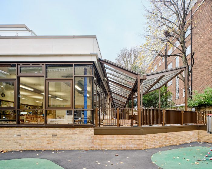 The design concept was to demolish the existing single-story Early Years wing and build a new three-story extension providing new teaching accommodation. Essential to the brief was access to the outside for pupils and staff. In such a dense urban site, space is at a premium so the new scheme ingeniously provides an updated covered play area for Early Years on the ground floor, with new roof terraces created on level 1 and level 3 for outside teaching with older pupils. The new extension is seamlessly stitched into the existing building and forms a bridge between two existing staircase towers.