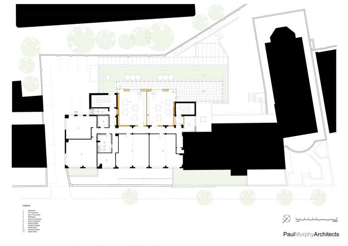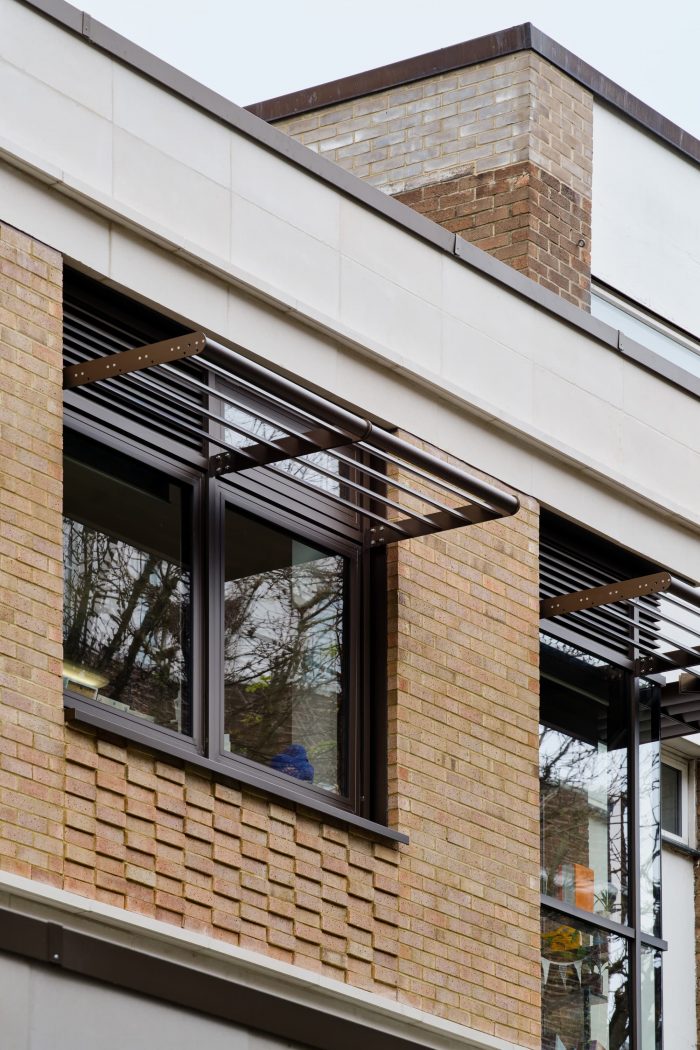 Externally, new brickwork matches the existing with patterned brickwork adding visual interest below the cill level. Punched windows to the new façade incorporate horizontal brise soleil and cast stone detailing following existing floor slab lines. External terraces are located at the first and third-floor levels, providing alternative learning spaces populated with planters – to be grown by the children - and overlook sedum roofs which provide visual amenities both from the school and neighboring residential properties and assist in withholding rainwater run-off.