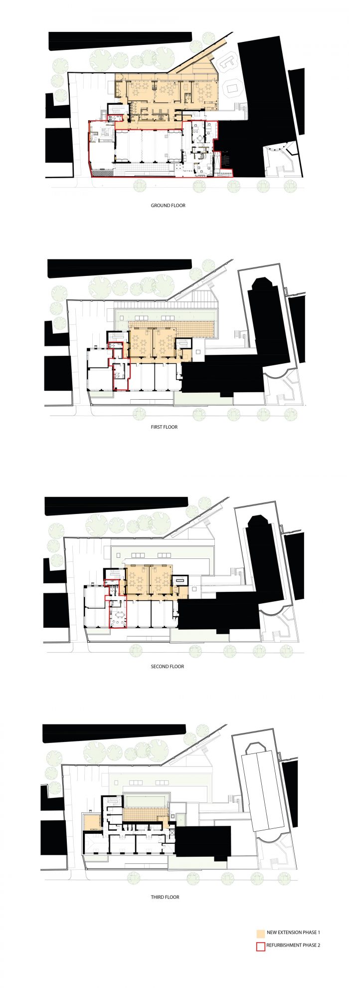 通过与学校及其理事的广泛磋商,制定了一个总体规划,其中包含了对学校的期望,然后将其分为两个阶段的发展项目。第一阶段已经完成,包括重新配置和扩建幼年部,在上面新建四间教室,以及增加教职工办公室和辅助设施。总体规划包括对学校进行重新组合,低层为幼儿部,高层为六年级/关键阶段的学生。第二阶段将重新配置主入口,将厨房迁离主入口,并对主厅进行翻新。