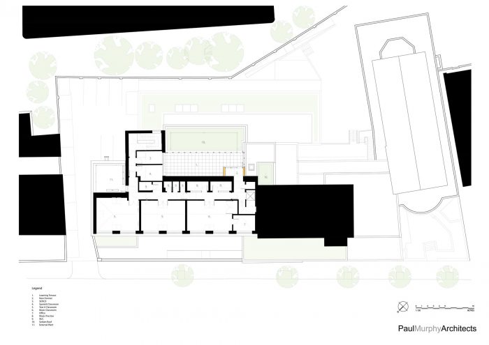 设计理念是拆除现有的单层幼教楼,建造一个新的三层楼的扩建部分,提供新的教学设施。该项目对于学生和工作人员来说,必须要有通往外部的通道。在这样一个密集的城市场地,空间是非常宝贵的,所以新方案巧妙地在底层为幼儿部提供了一个最新的有顶的游戏区,并在1层和3层建立了新的屋顶露台,供高年级学生进行户外教学。新的扩建部分与现有建筑无缝衔接,在两个现有的楼梯塔之间形成了一座桥梁。