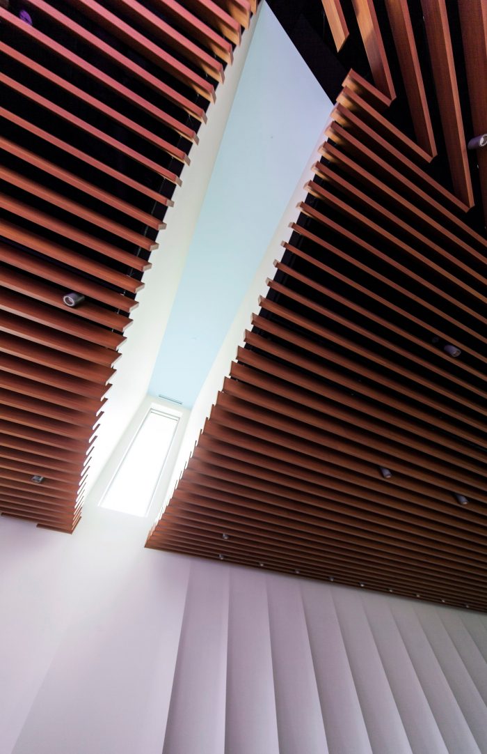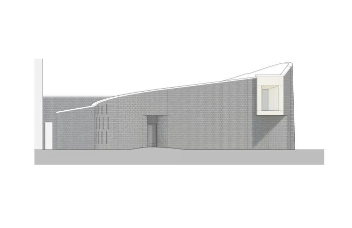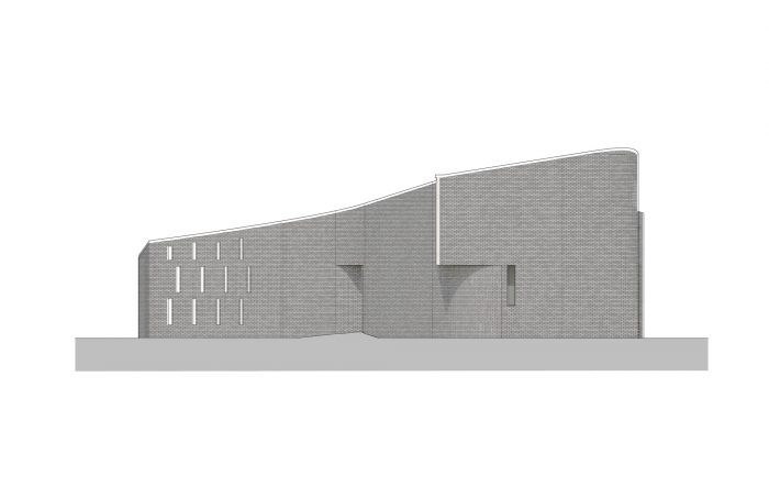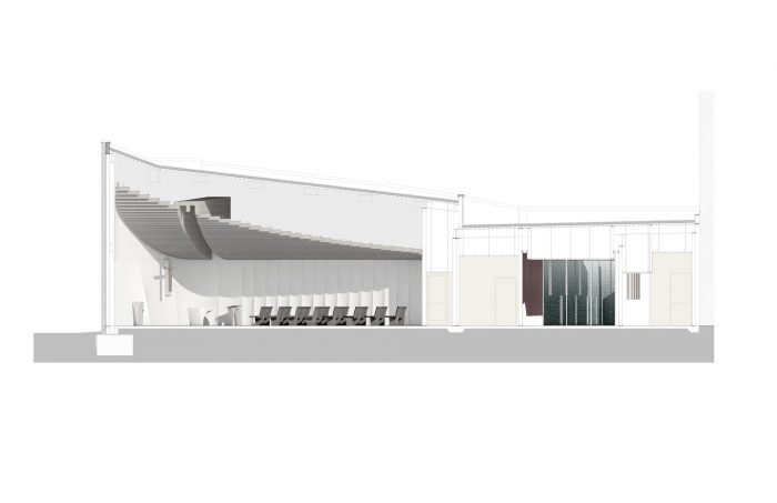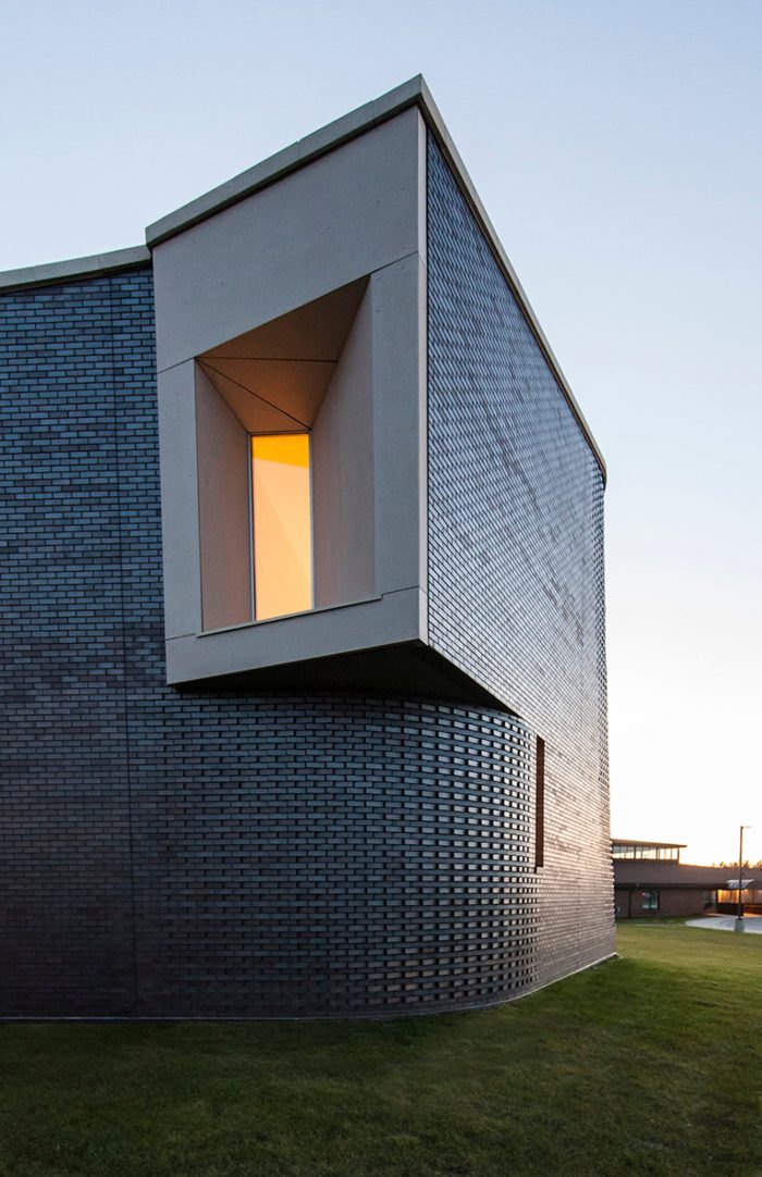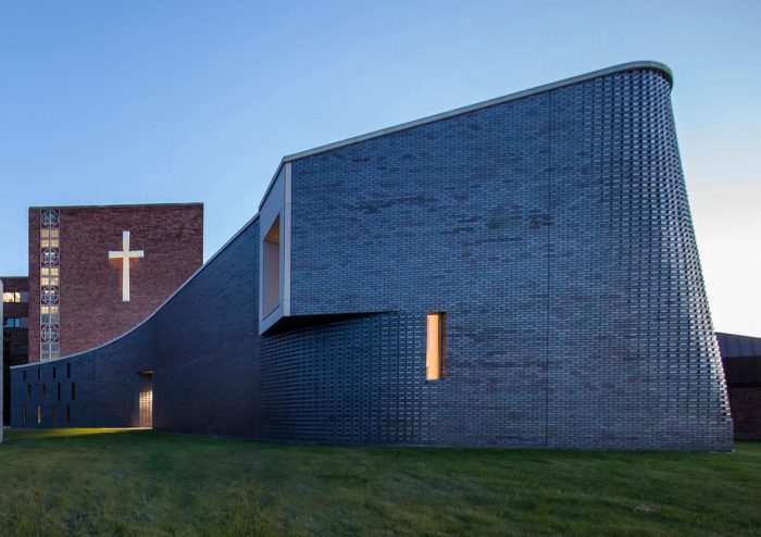 The geometry of the conical corner of the chapel celebrates the position of the tabernacle, the most important liturgical element within the chapel. Within the chapel, the development of the ceiling geometry strengthens a visual connection with the tabernacle in contrast to the processional axis of the space which aligns with the solid stone carved altar. On the exterior, this important corner is accentuated by the patterning of the brick work.
