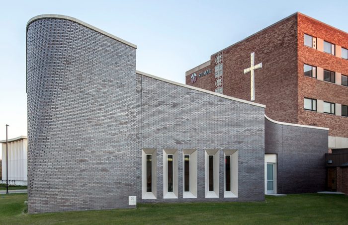 The location of the addition was determined during the initial conceptual phase of design and was selected because of its visual prominence from the approach to the north entrance of the hospital and to allow the new chapel to visually “borrow” an existing cross on the north façade of the hospital. Our formal approach to the project explores the potential for brick to achieve both smoothness and definition to achieve unity across a variety of uses and give an overall expression of a spiritual center.