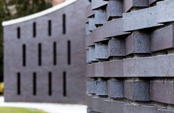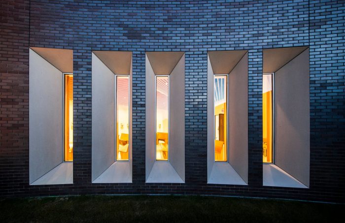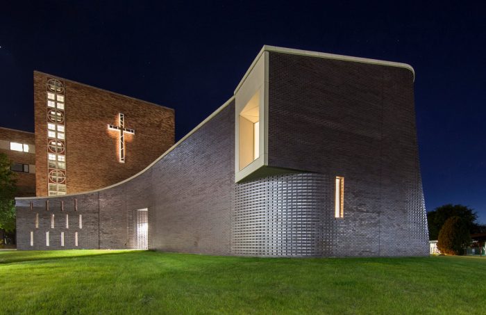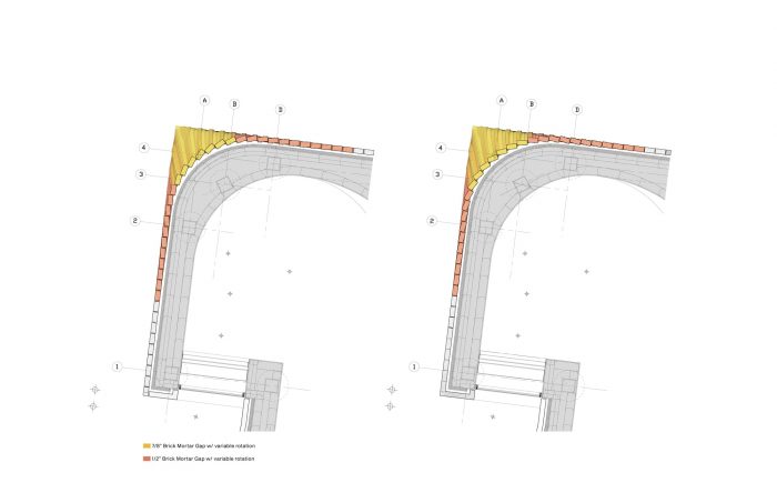 The brick coursing involves rotating masonry in a clockwise orientation from a running bond pattern to a rotating pattern and back again to running bond after rounding the corner. The following course follows the same logic with a counter-clockwise rotation thereby establishing a “woven” pattern at the corner. Ironspot was selected for the brick color to distinguish the chapel from the existing hospital context and take advantage of the material’s reflective qualities which appear dynamic as light reflects off of the curving and rotating facade.