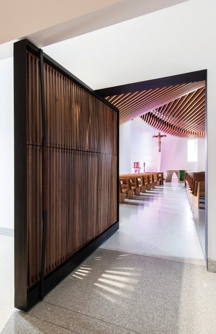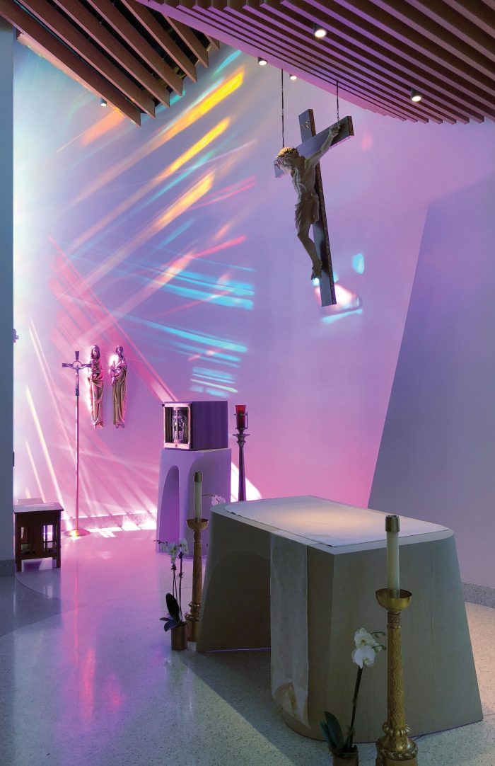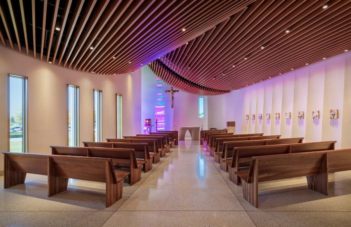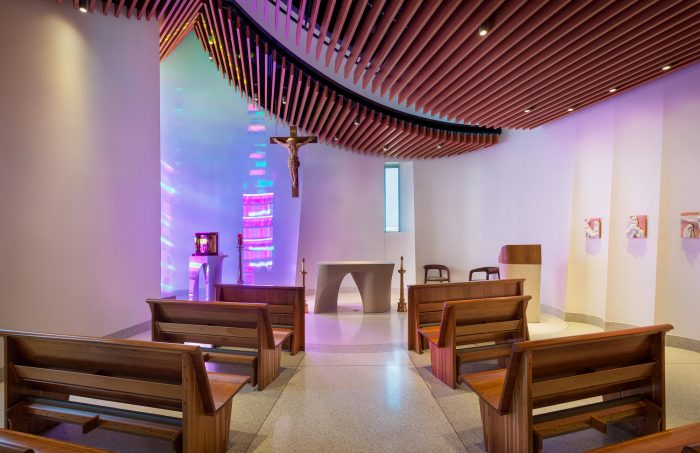 To accomplish this, the chapel’s form begins low where it meets the existing hospital and rises up to provide a more vertically generous space in the chapel and to convey the importance of this addition. The chapel’s apertures match orientations with programmatic opportunities including a high, east window to provide early morning light for the daily 6am mass, a southern opening that holds a special installation of dichroic glass that bounces spectral colors into the space, and a western row of windows that establish a relationship with a future phase healing garden.